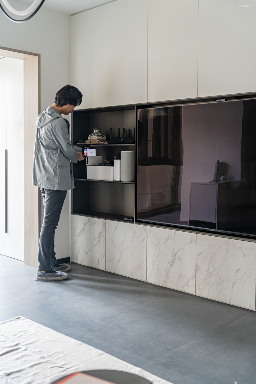 客厅电视柜的设计则完全满足收纳需求,中间开放的部分安放电视+设备。上下区域则完全作为收纳空间使用。