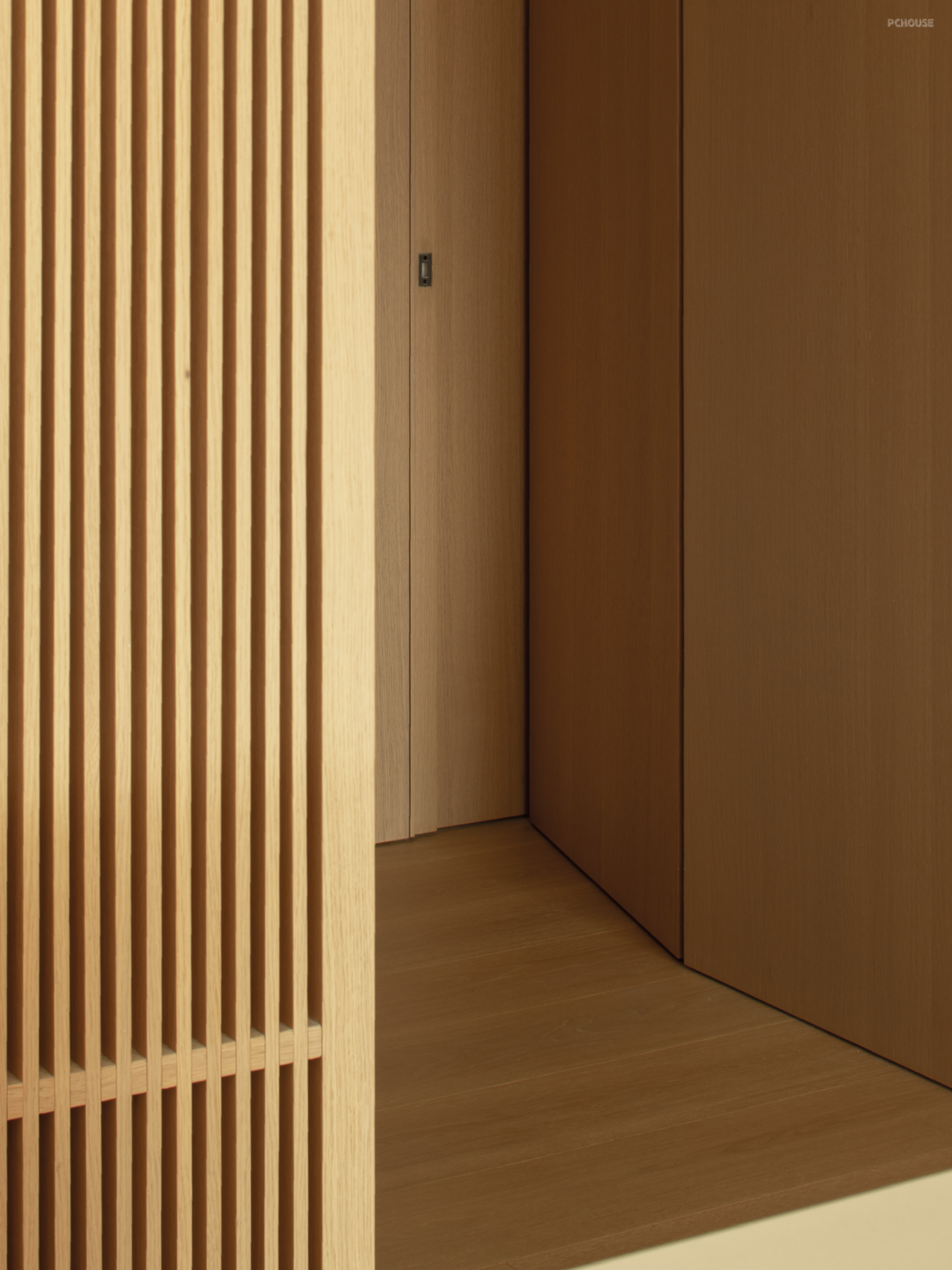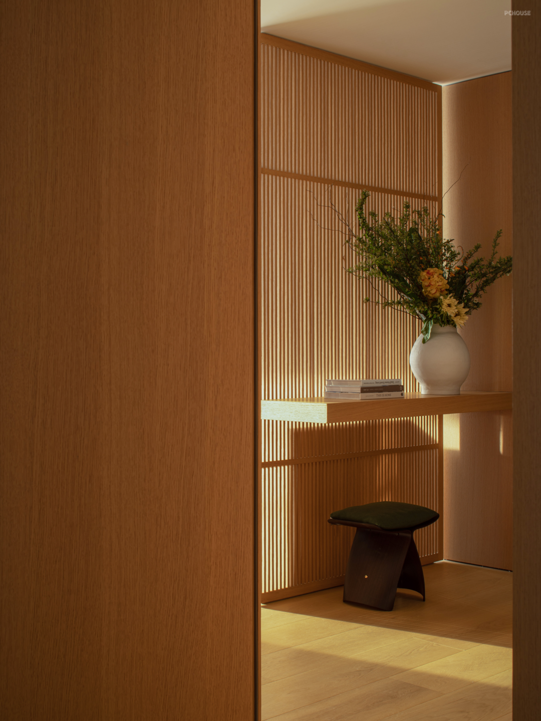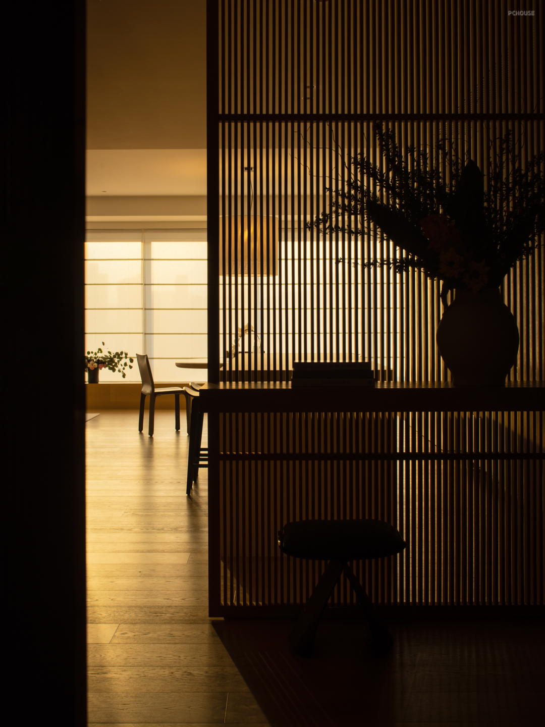 配合阳光进入的路径,在玄关处设置木作格栅,傍晚光线以最大的角度倾入室内,条条分明的光影落于墙壁地面,为空间提供直观的时间概念,活化居住在当下的情感印记。