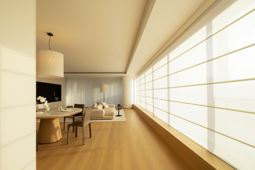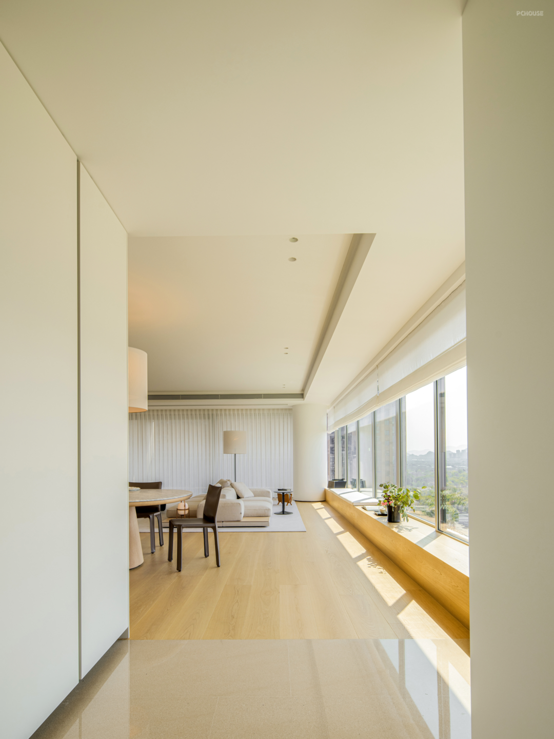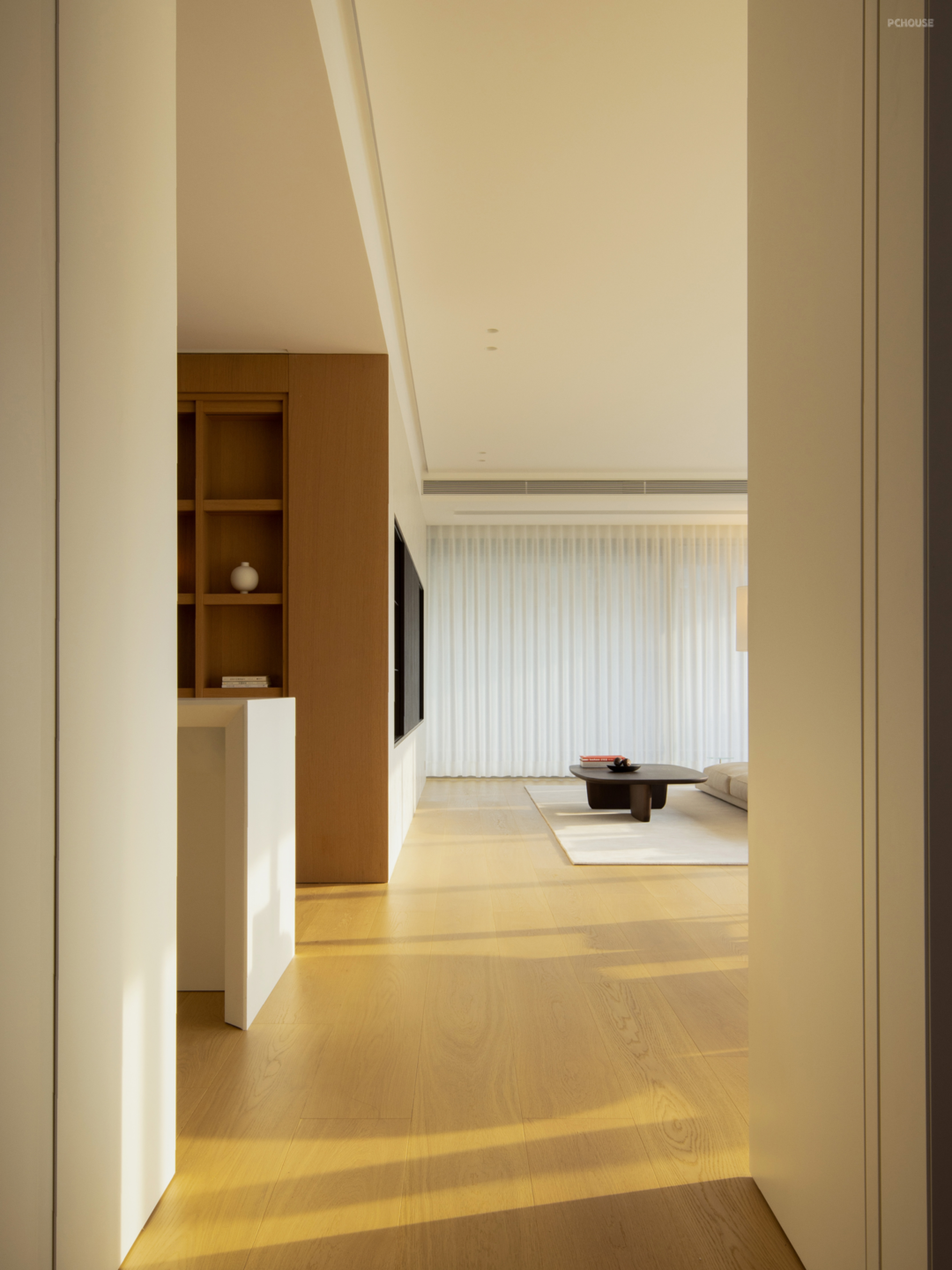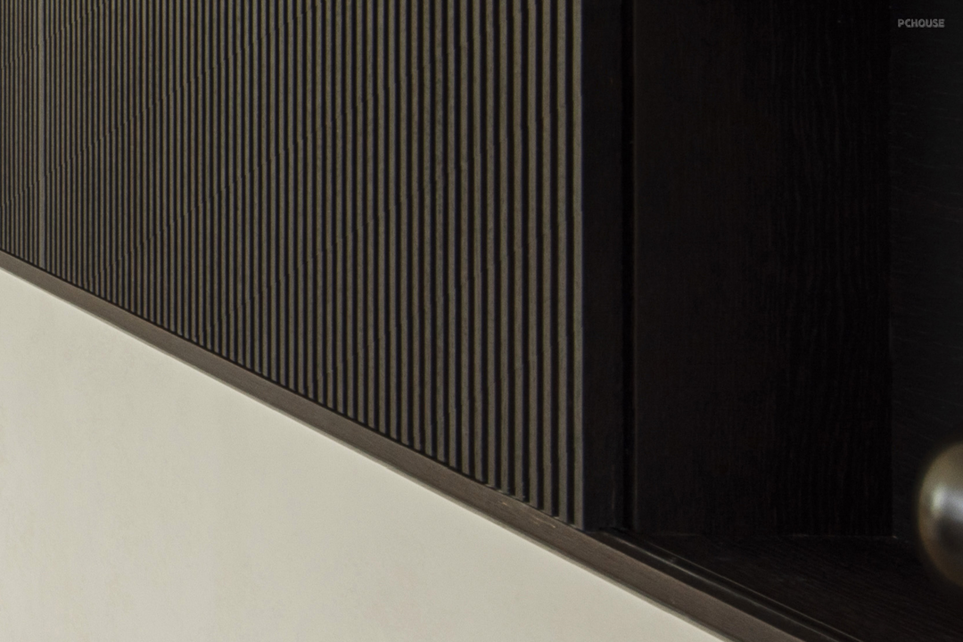 配合阳光进入的路径,在玄关处设置木作格栅,傍晚光线以最大的角度倾入室内,条条分明的光影落于墙壁地面,为空间提供直观的时间概念,活化居住在当下的情感印记。