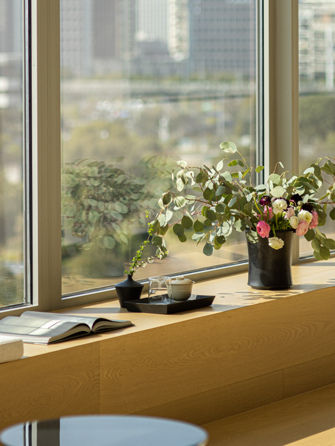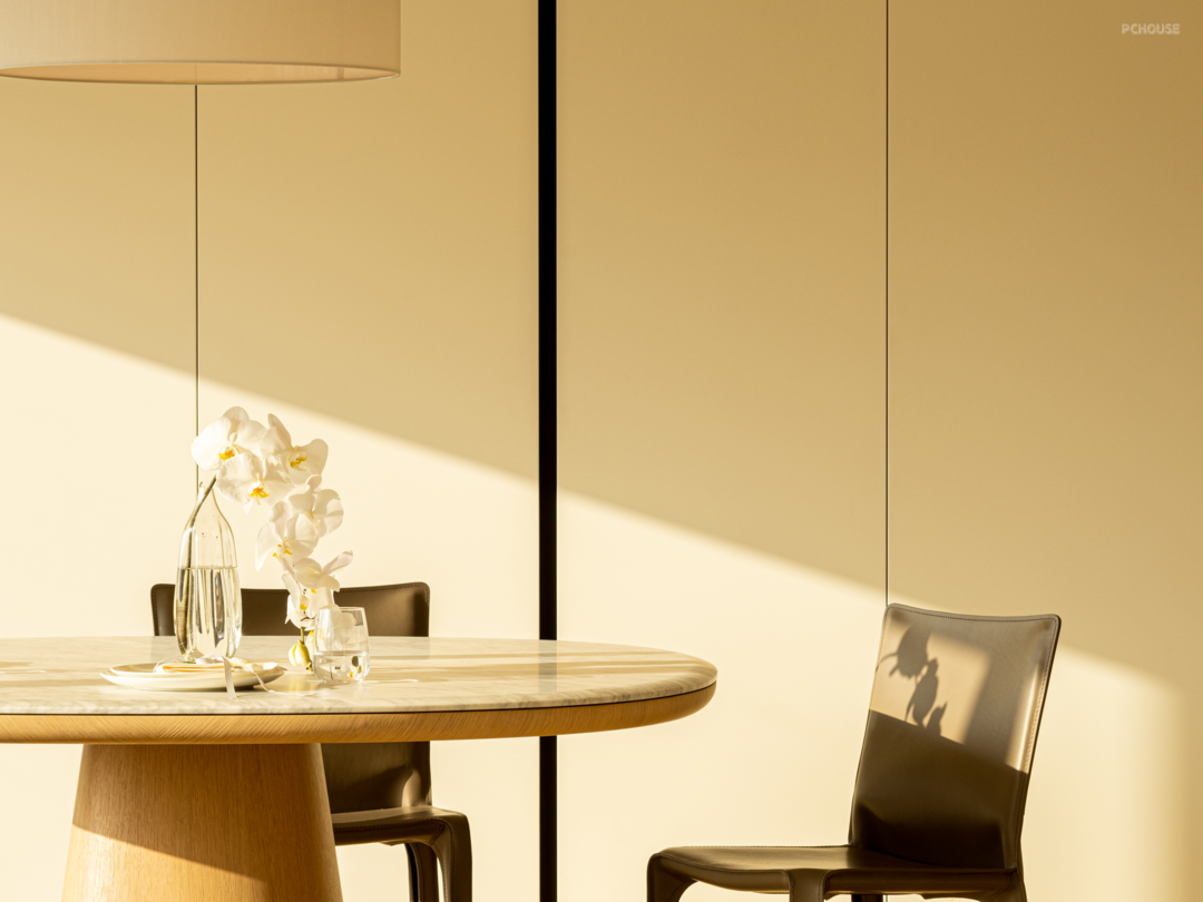 设计秉持着折衷的设计理念,将空间的语言简化后,意图呈现一个理性与柔美、质朴与精致并存,且兼具外向舒展与内向沉淀的空间。