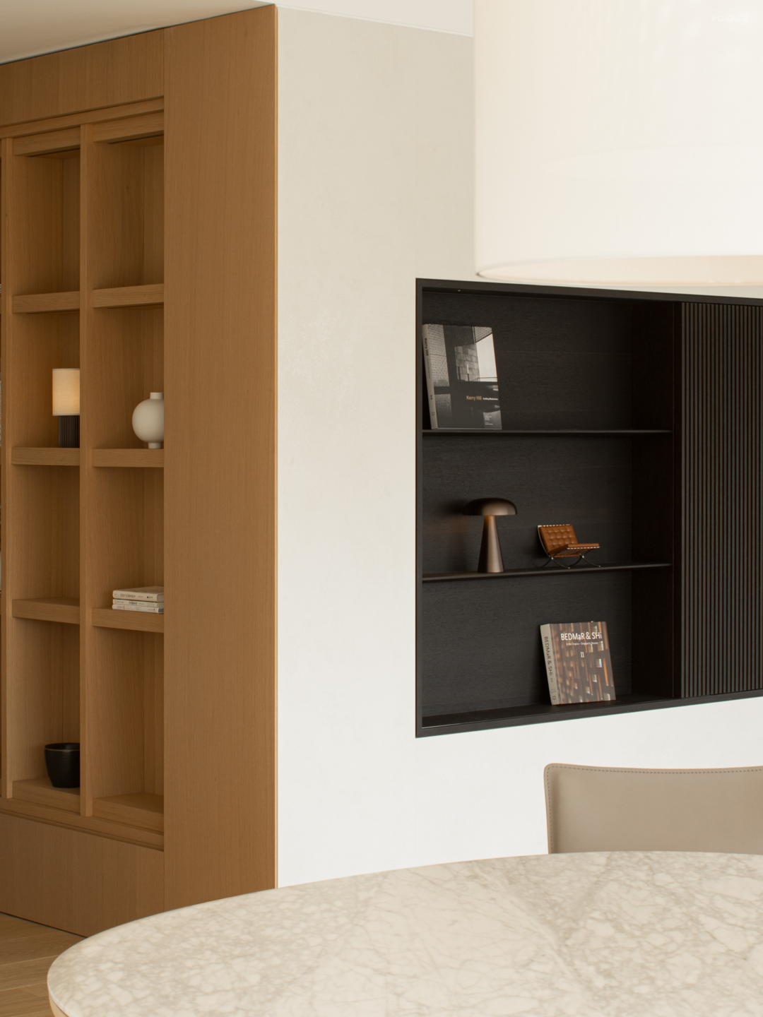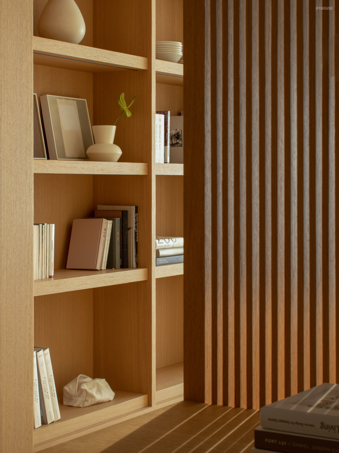 敞开式书柜的结构本身并不复杂,难点在于纵横的线条间需要完全平直,且与周边的柜体间保持一致且纤细的空隙。