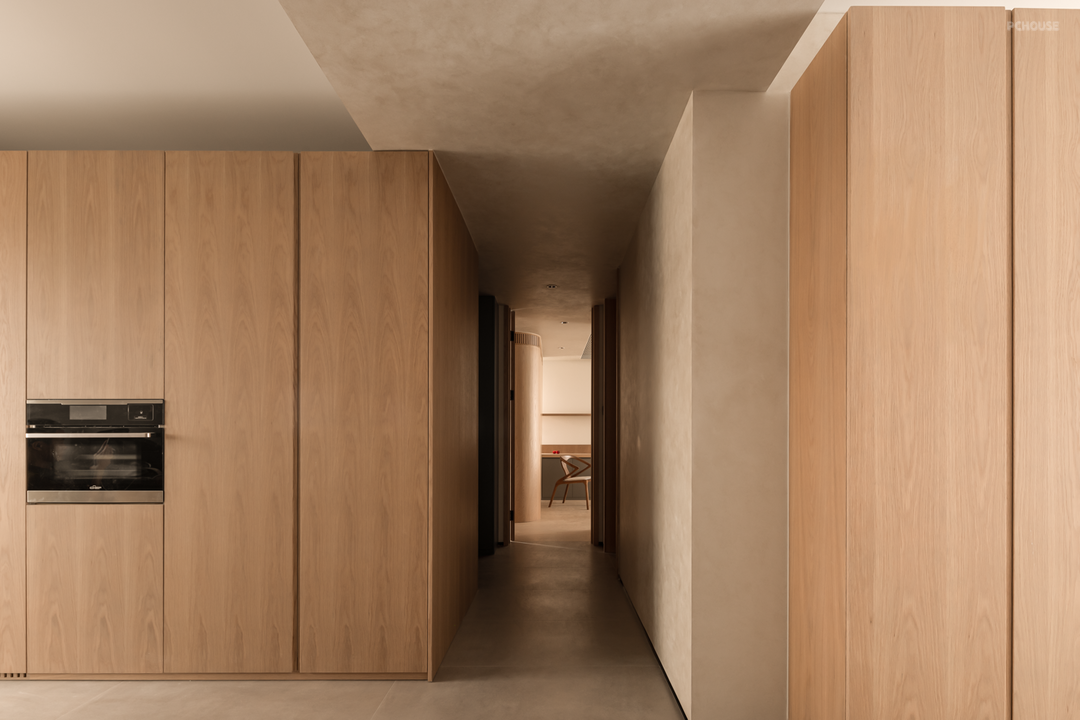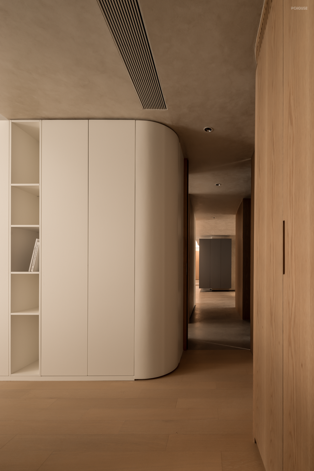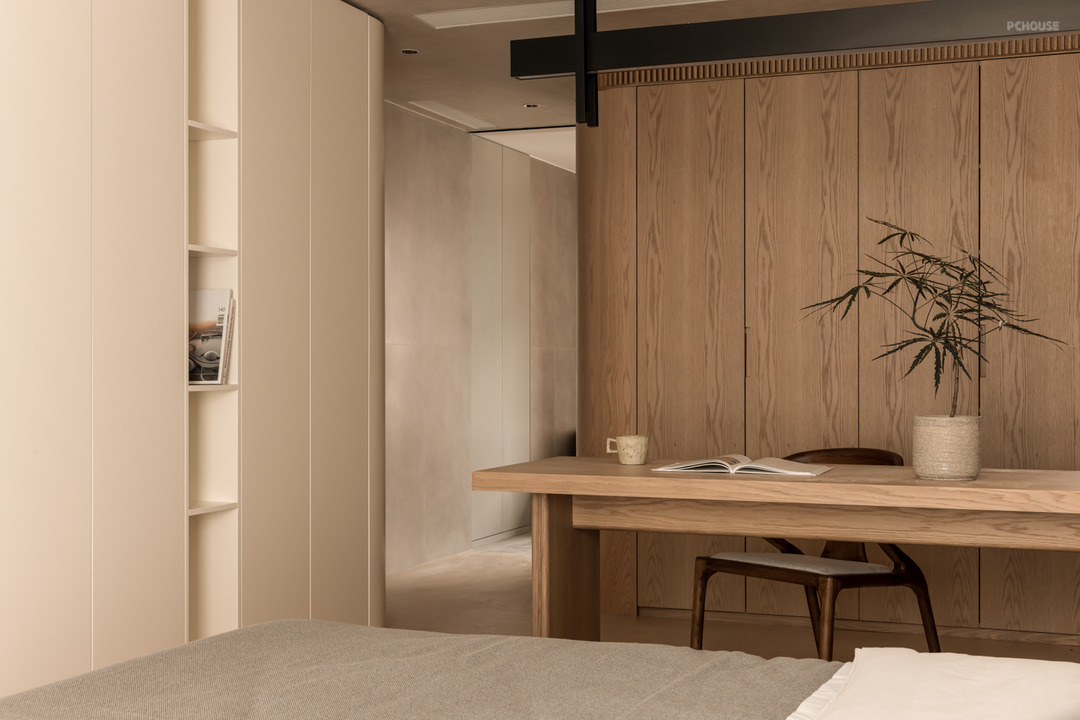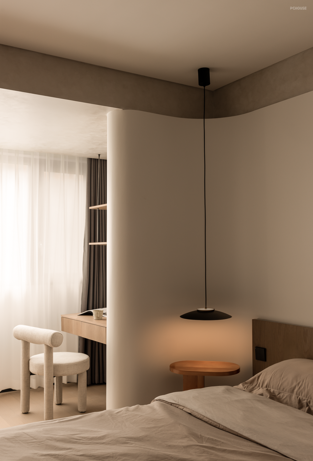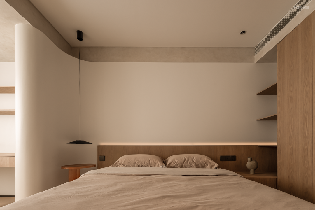 卧室房门均采用隐形门,并进行了加高处理,视觉更为统一大气。大量的圆弧转角并非刻意为之,而是为了让动线更柔和,以及掩饰顶部梁体缺陷。