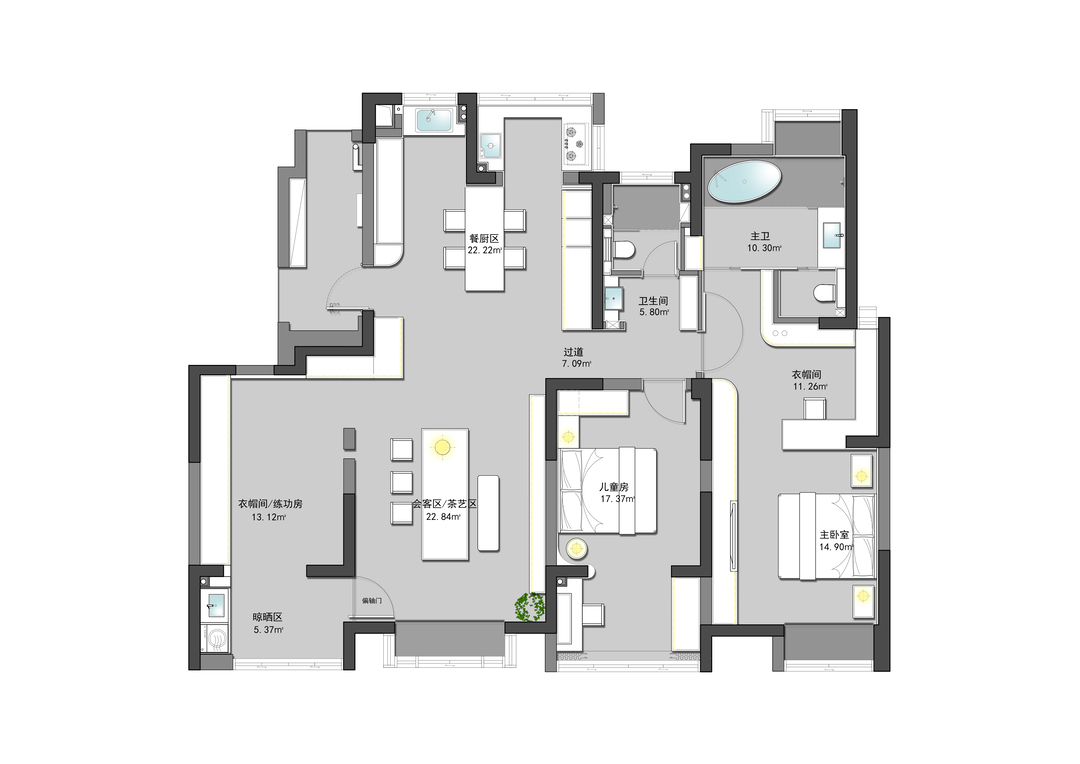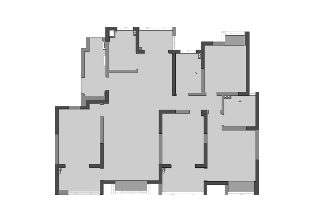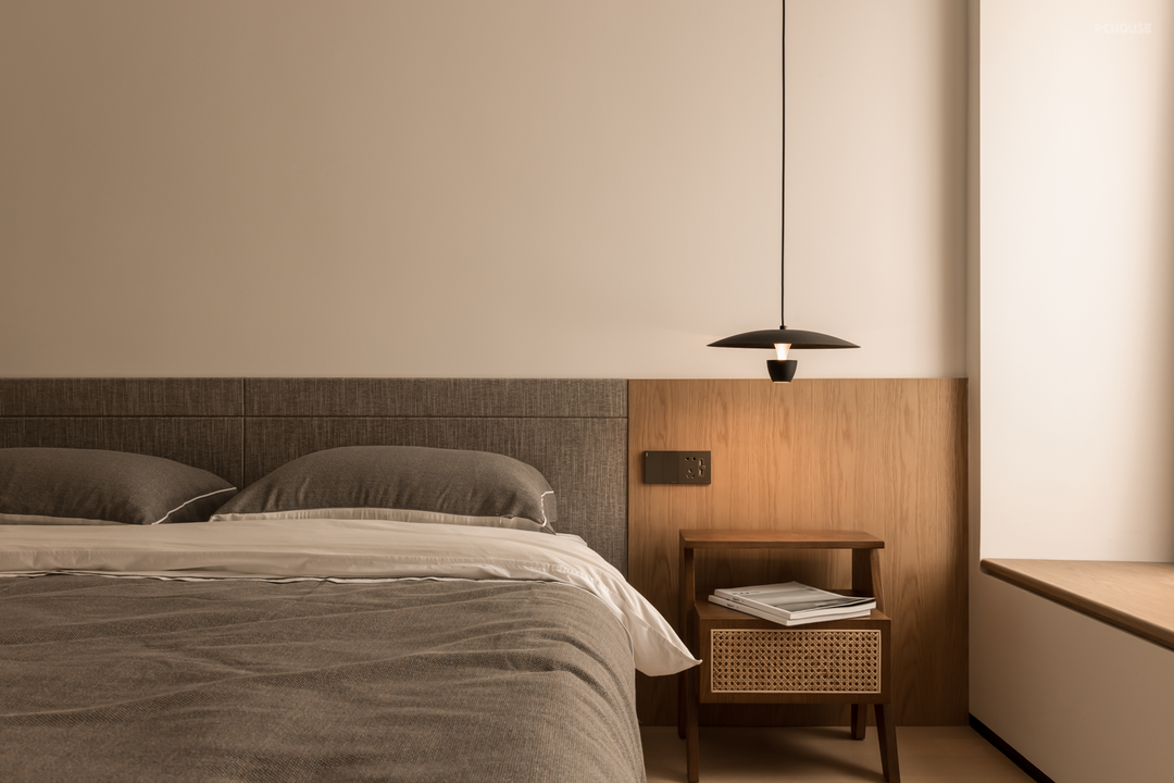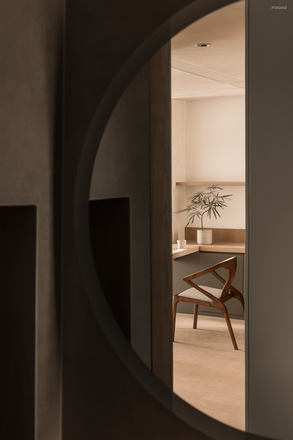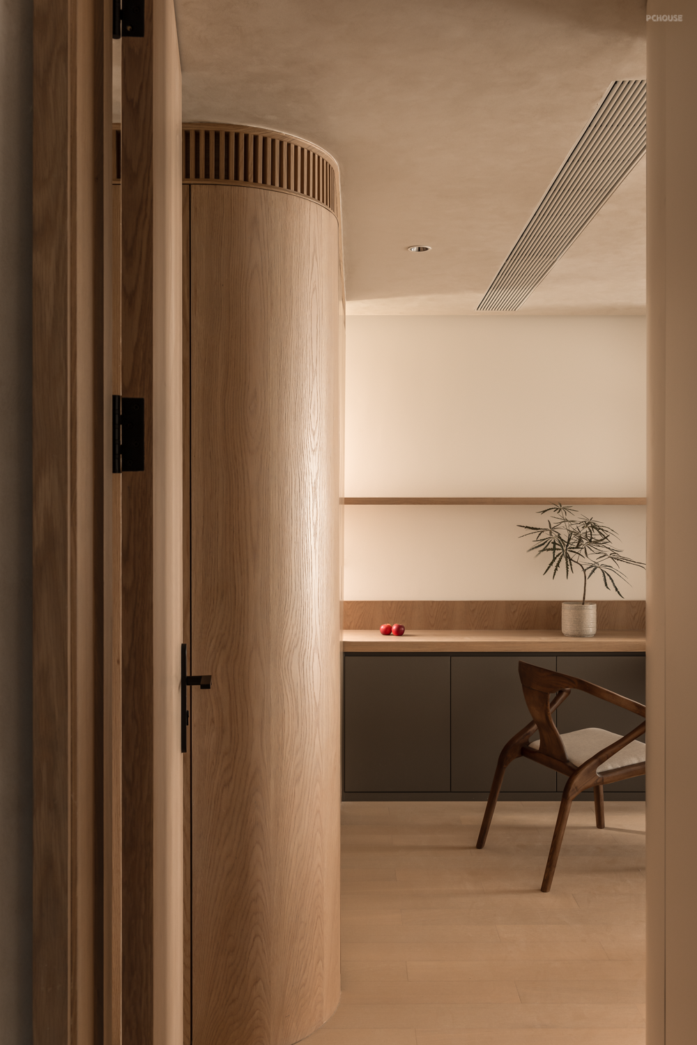 卧室房门均采用隐形门,并进行了加高处理,视觉更为统一大气。大量的圆弧转角并非刻意为之,而是为了让动线更柔和,以及掩饰顶部梁体缺陷。