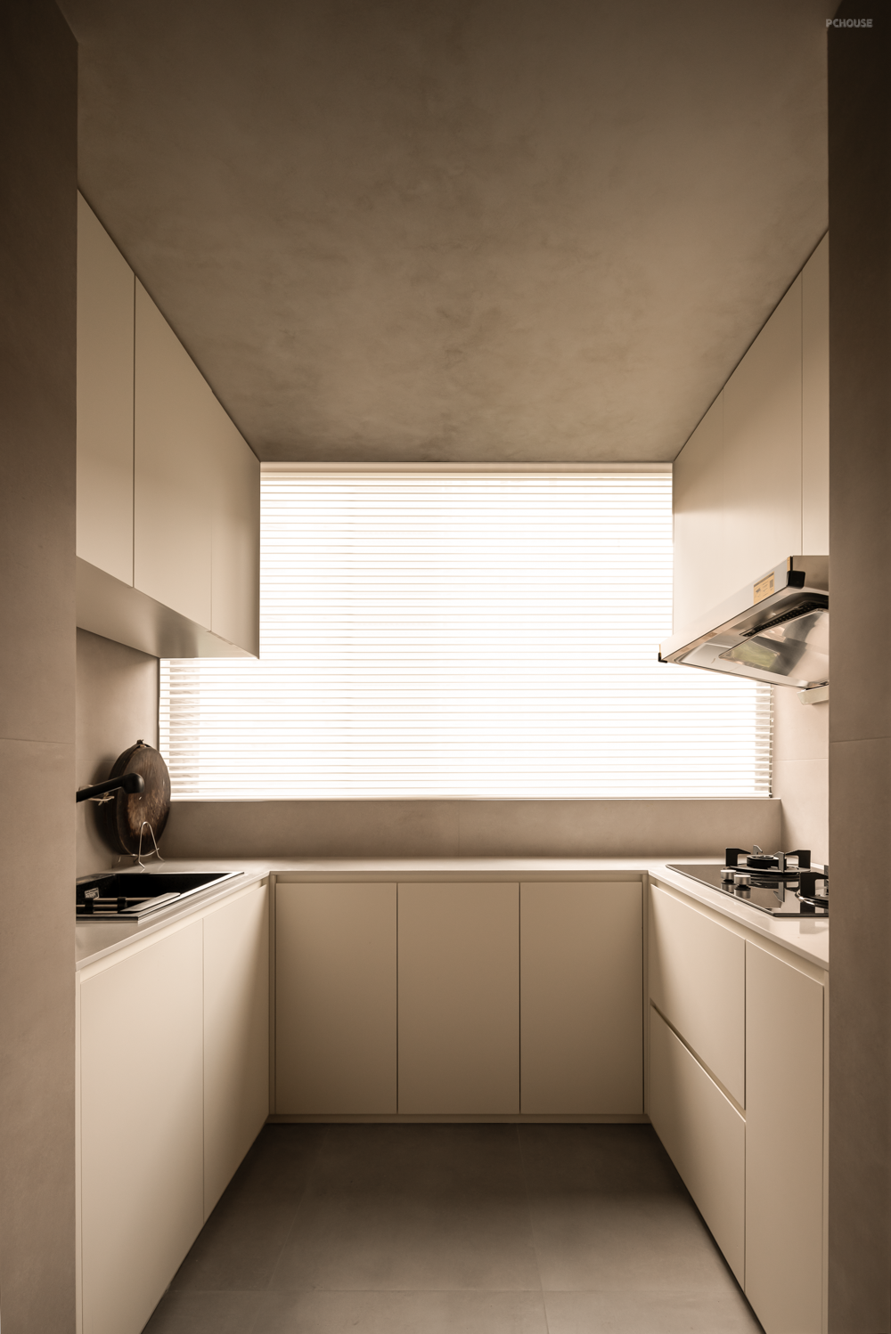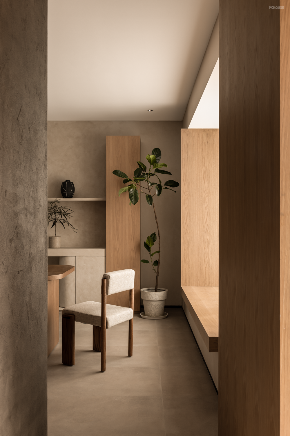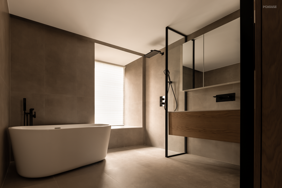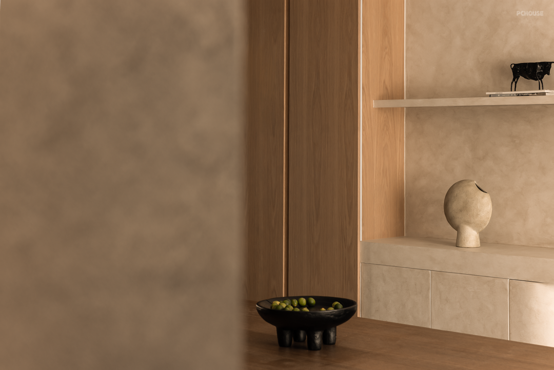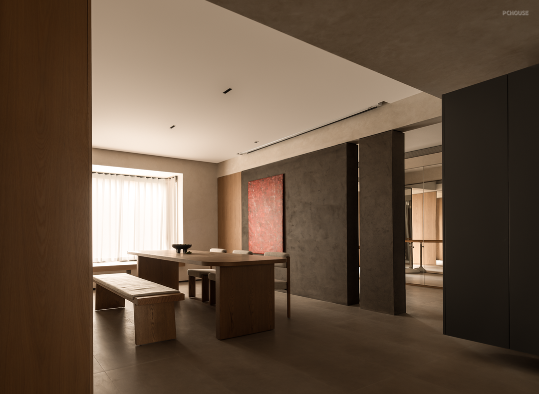 设计师以偏轴门、L型窗框,以及镂空景墙结合的形式,强化了客厅与瑜伽室的互动关系,使空间变得通透连贯由独立。