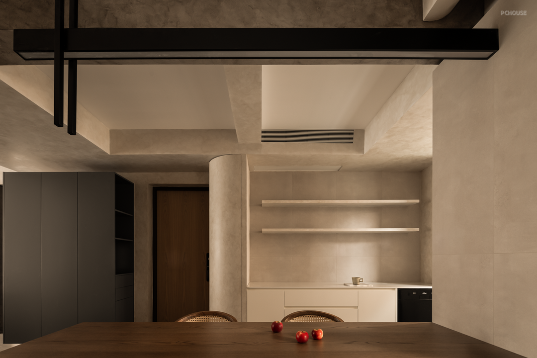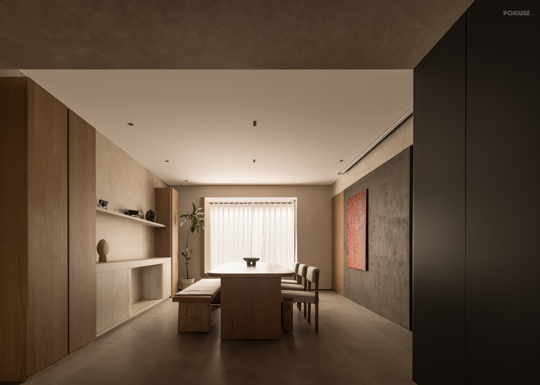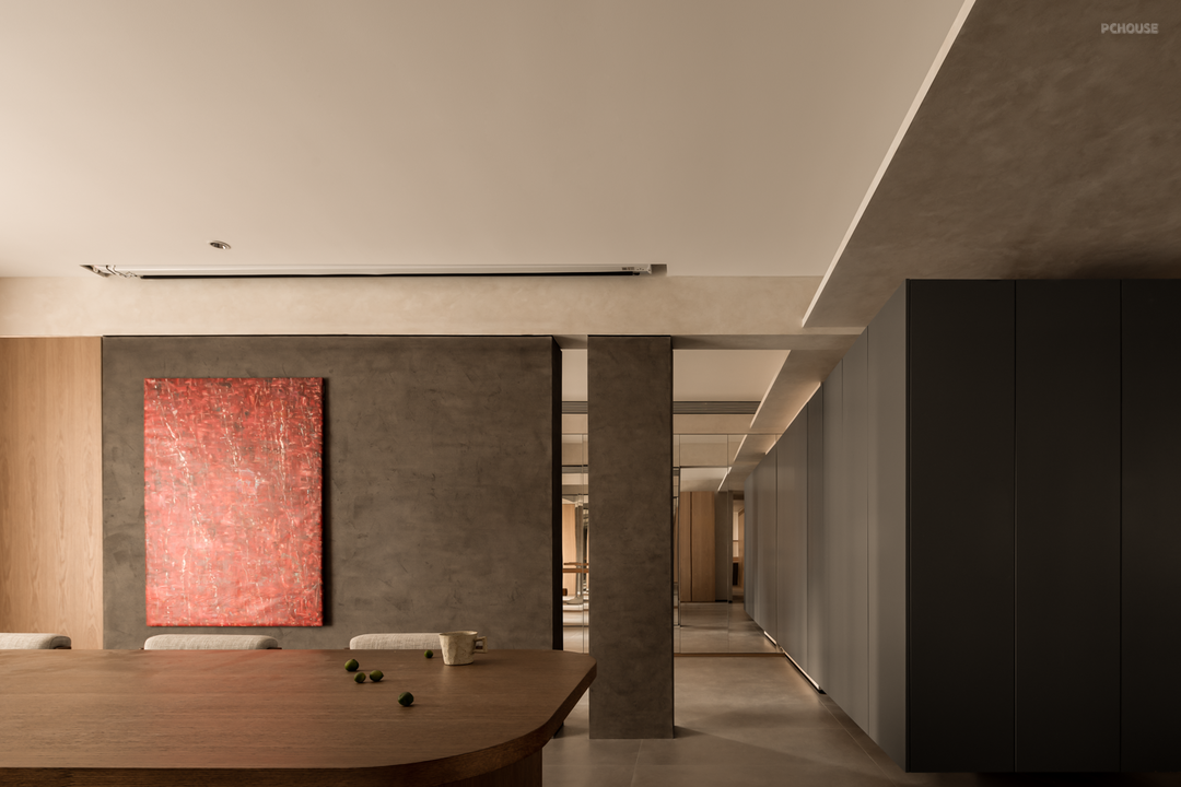 餐厅上方借由不同层次和材质的直线顶,来打破中央大梁带来的压抑和孤立感,化瑕疵为艺术,既保留原有的层高,同时又隐藏了移门轨道,丰富了采光。