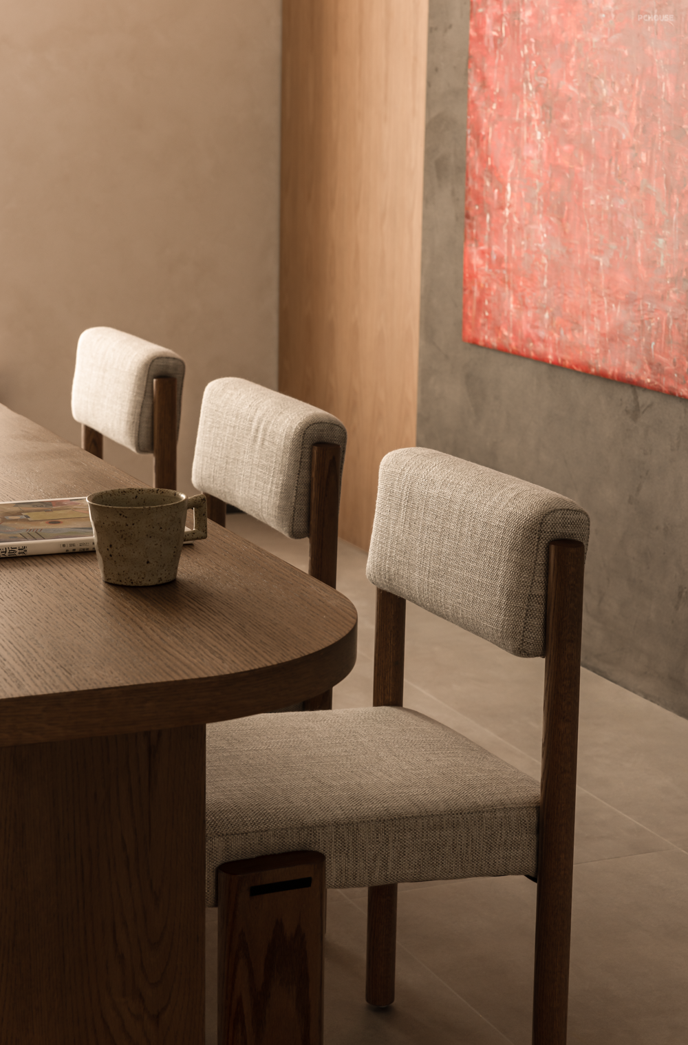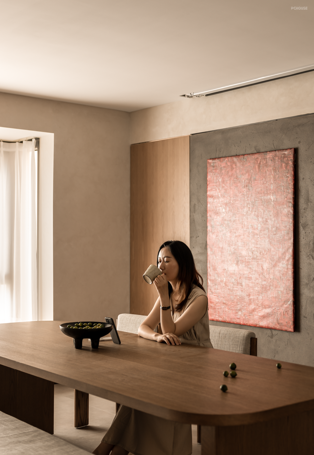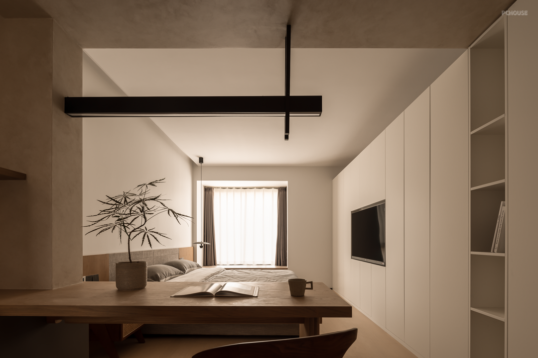客厅没有采用传统的布局方式,而是用一张大书桌作为公共空间的核心区域,顶上设有电动幕布,既满足屋主平时用书法会友竞技的需求,也可以偶尔在家观影。