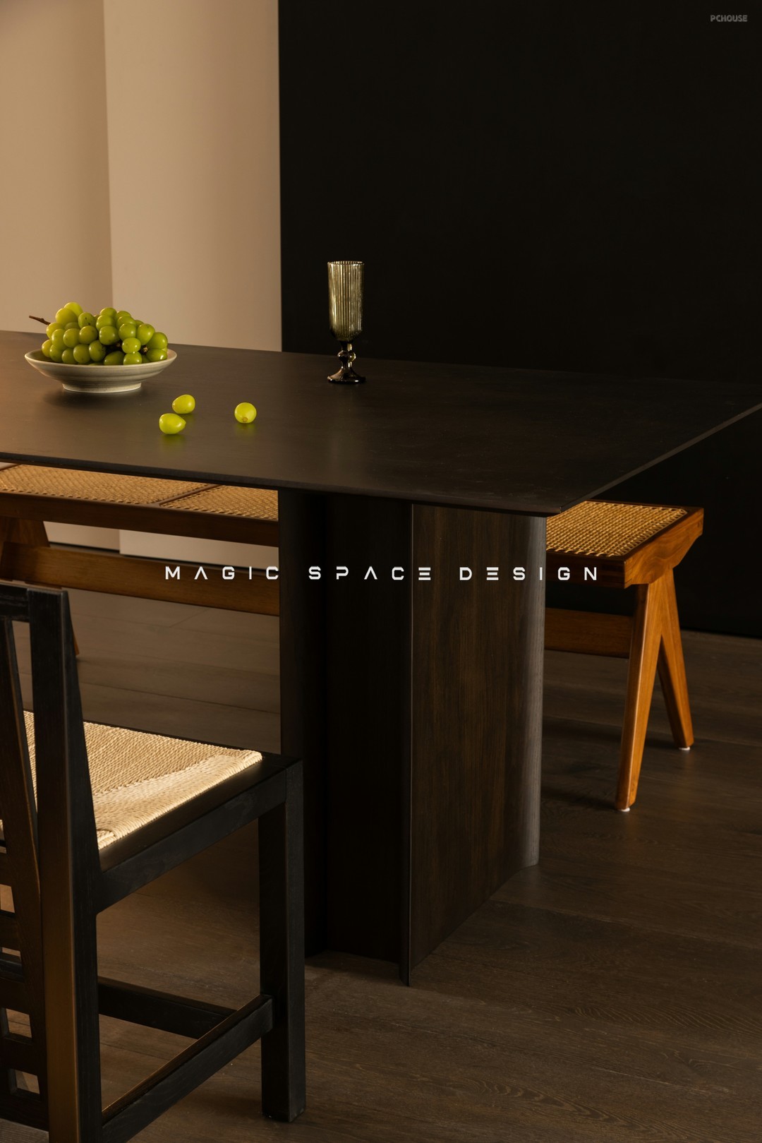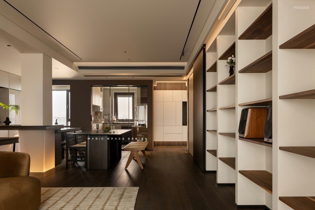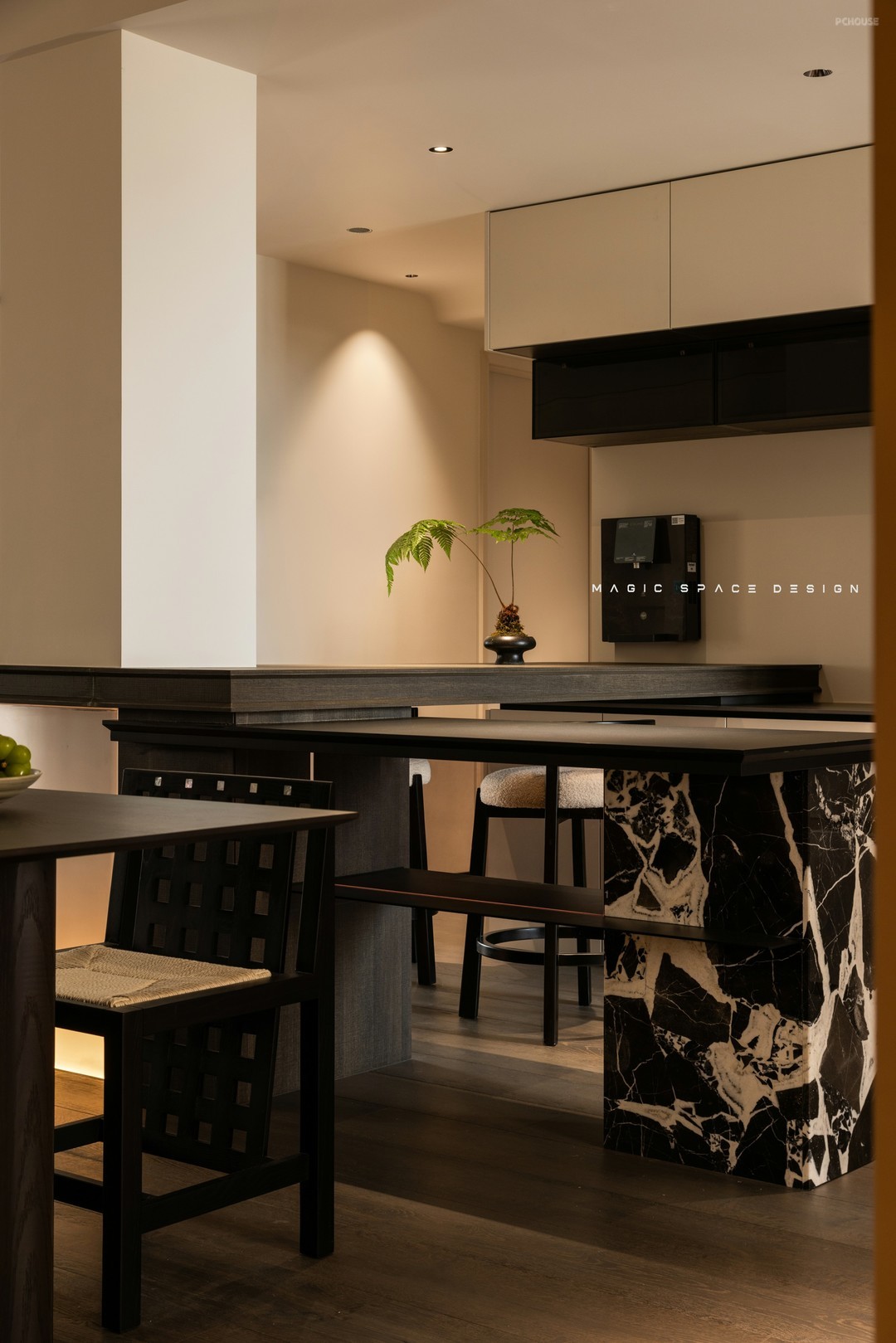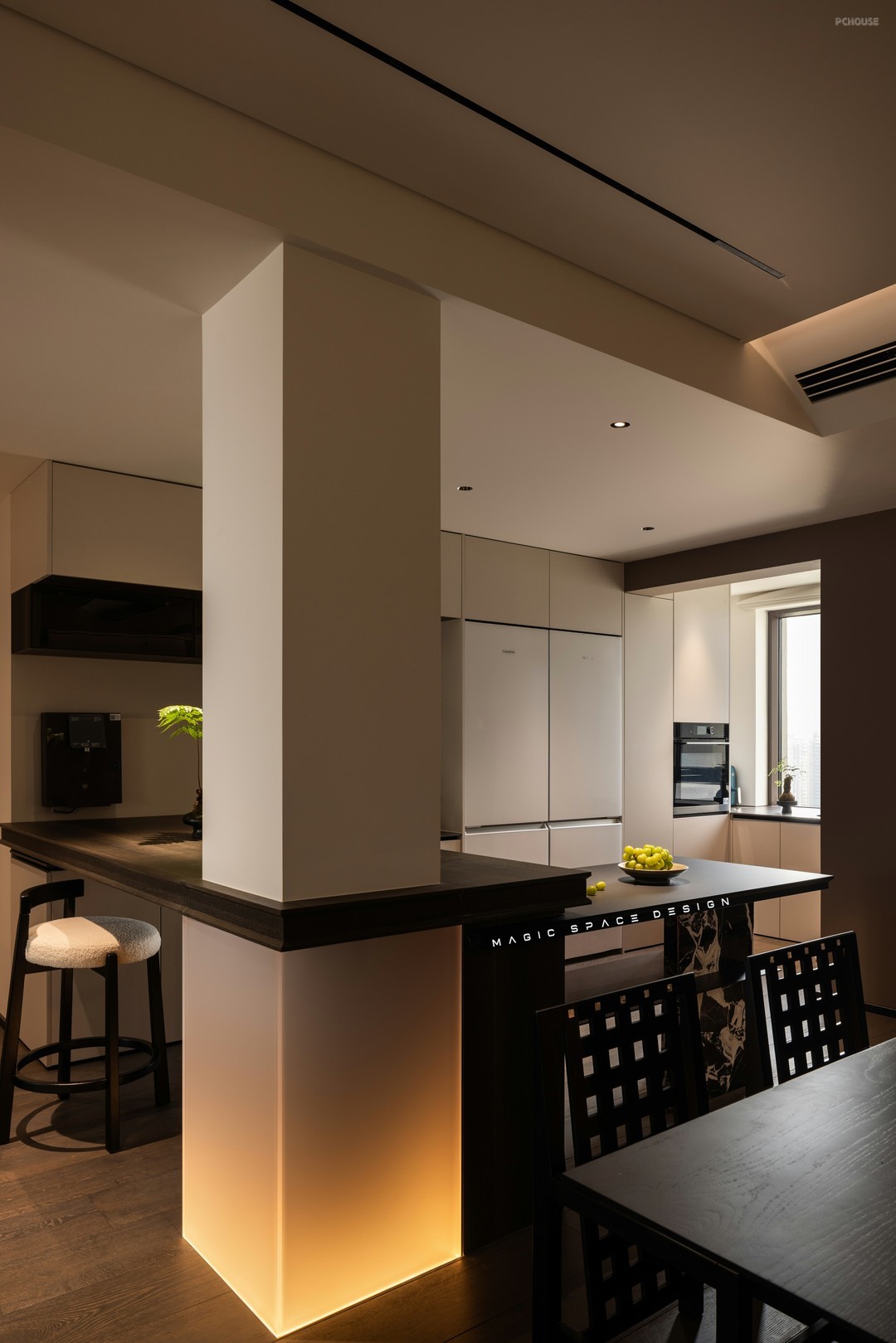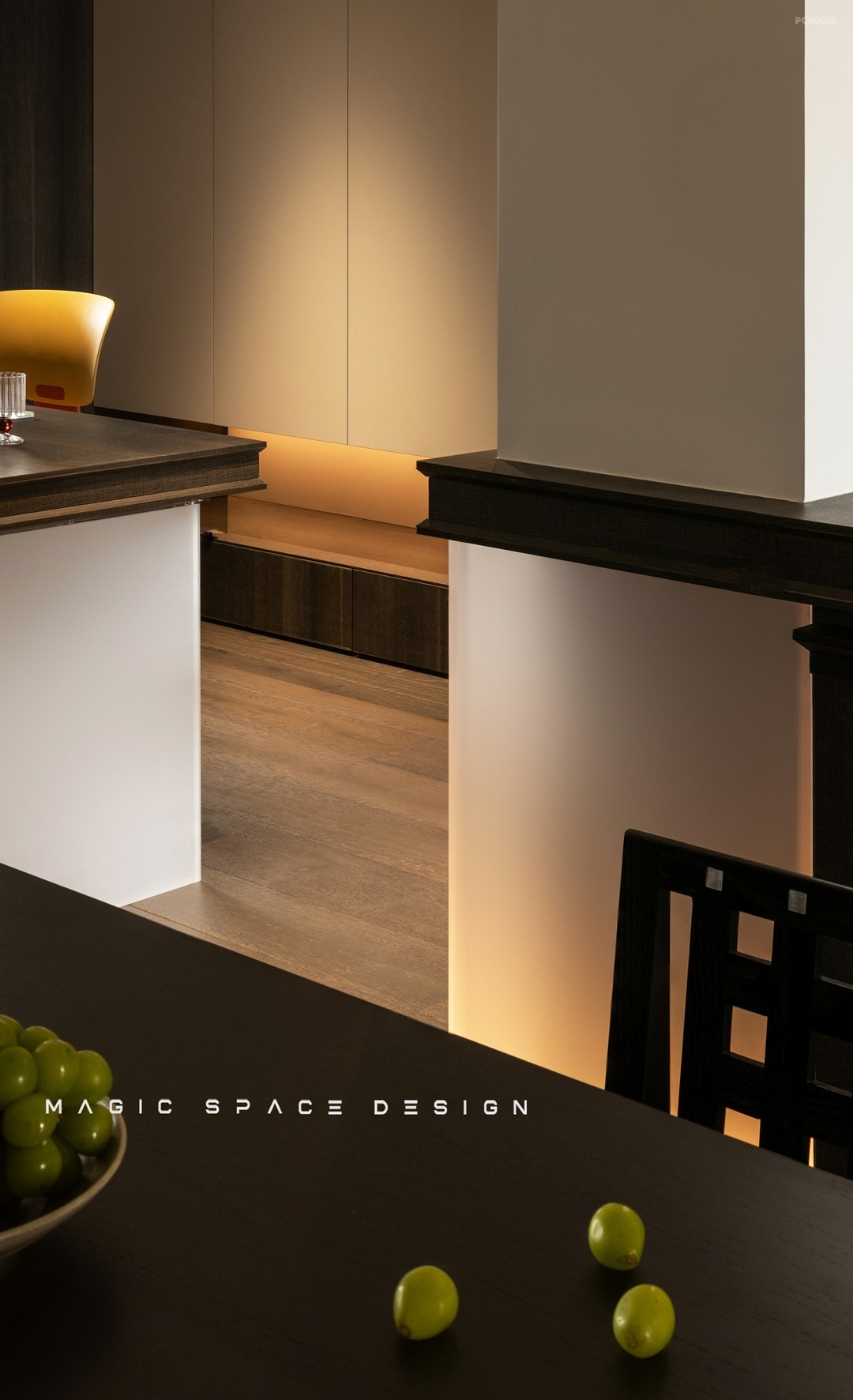 亚克力材质携手暖光调和了立柱的生硬感,吧台紧跟其上创造灵动而稳定的错落层次,为厨房划分出了多个透气图景。黑胡桃色家具,充满艺术美感。不同大小的镂空造型,对话细腻的编织肌理,彰显质朴感与纯粹感。