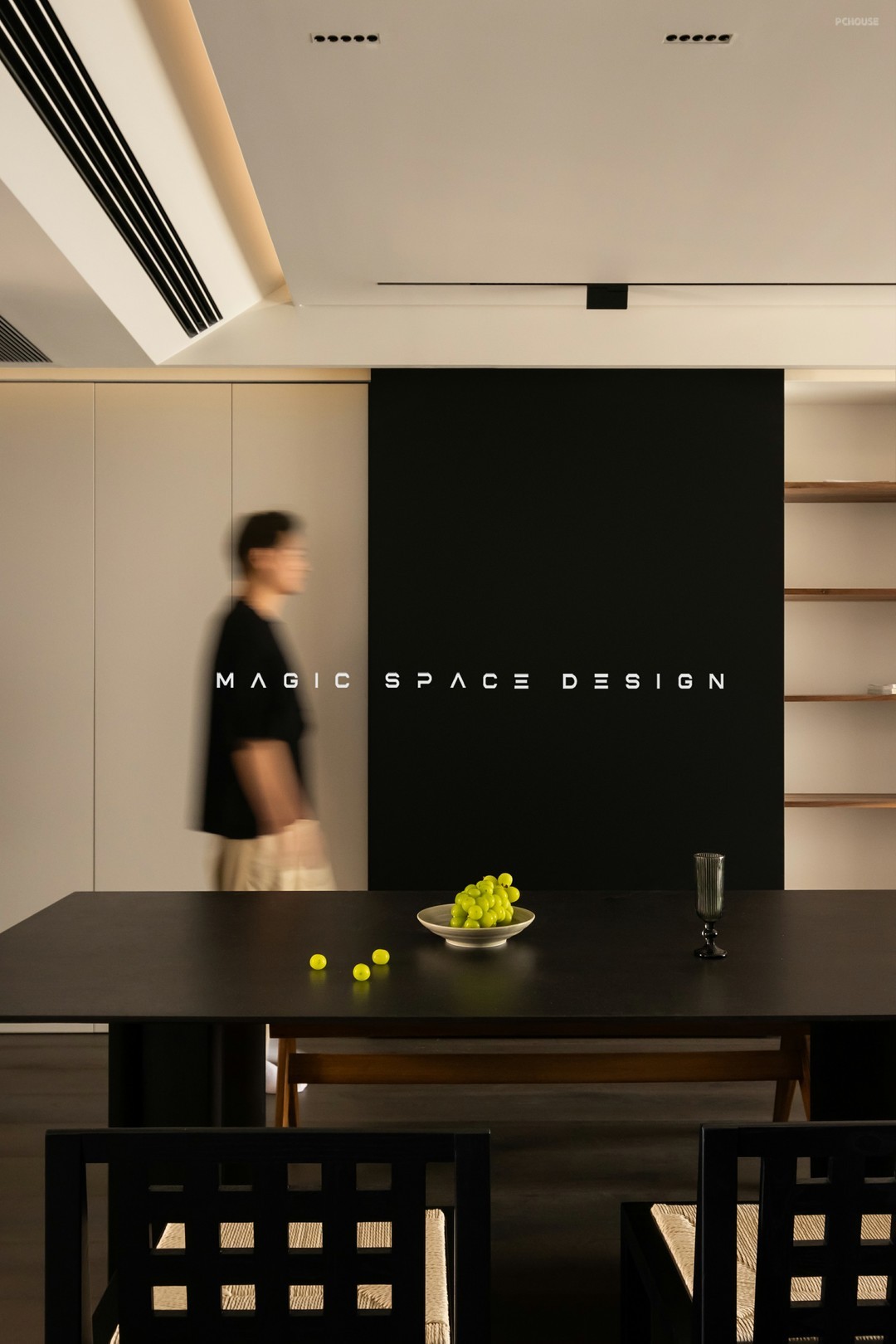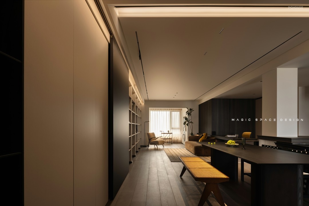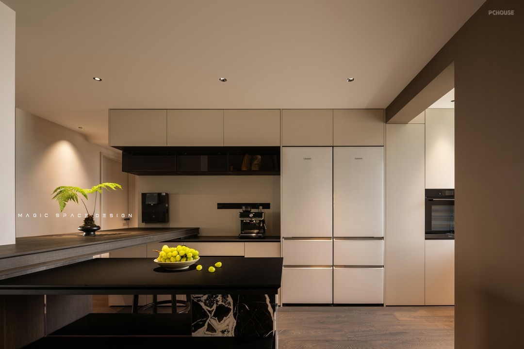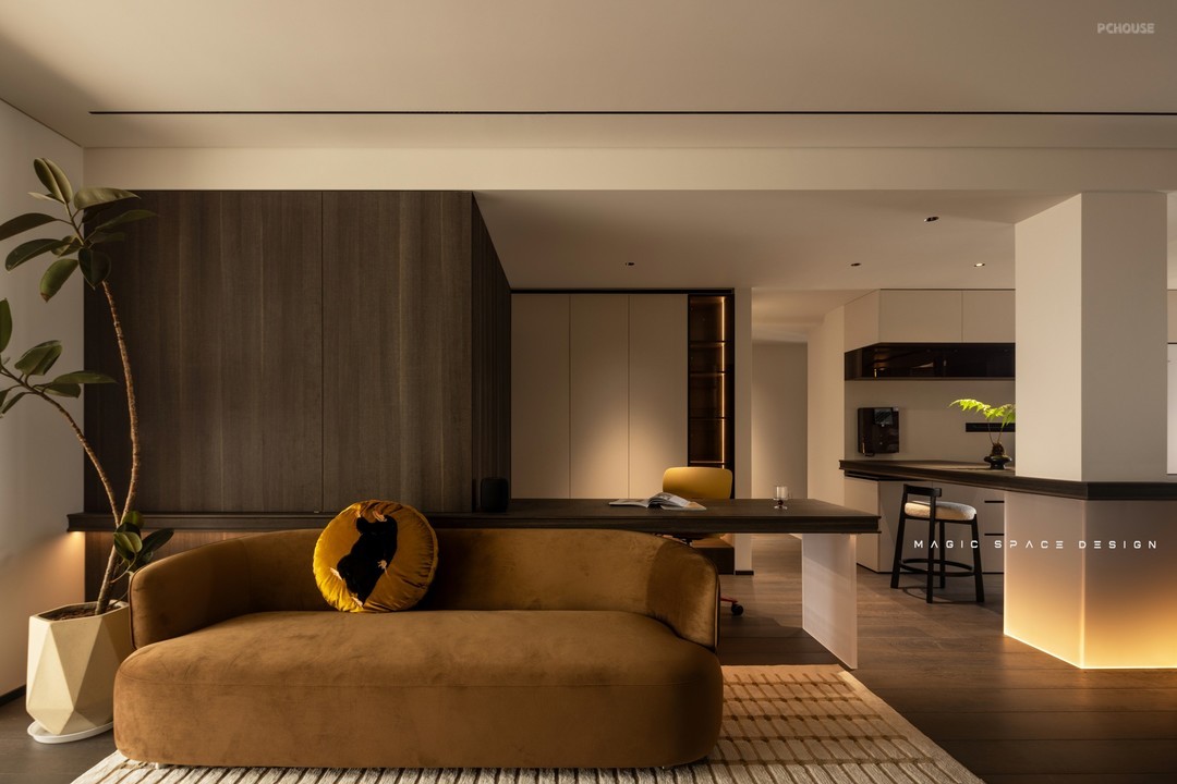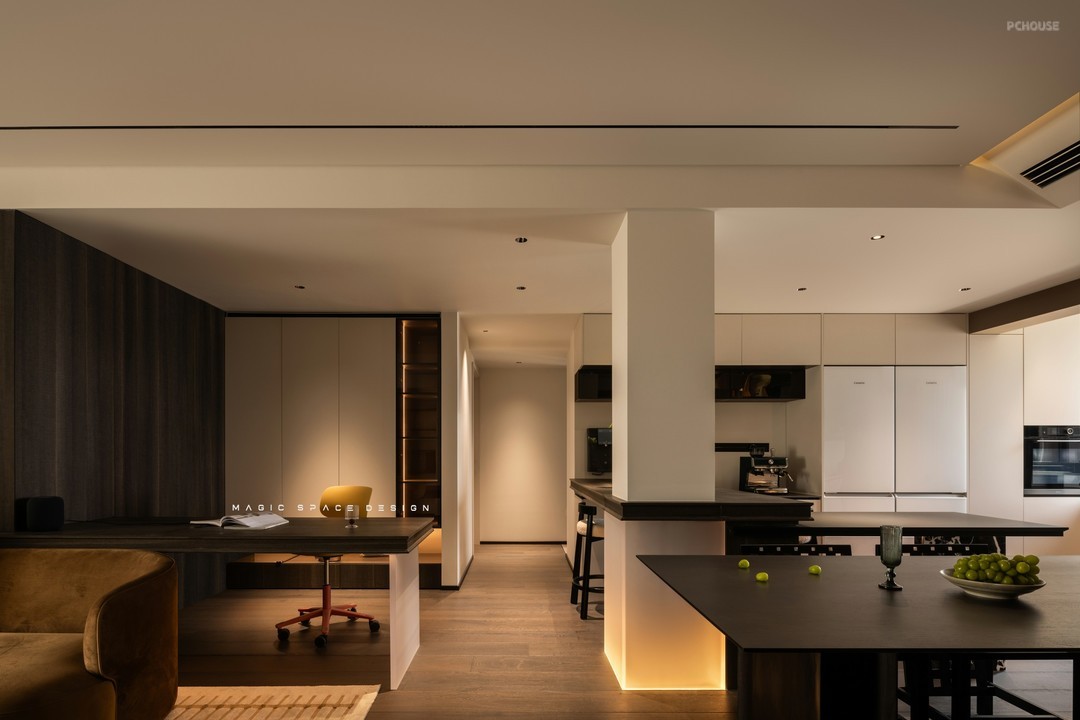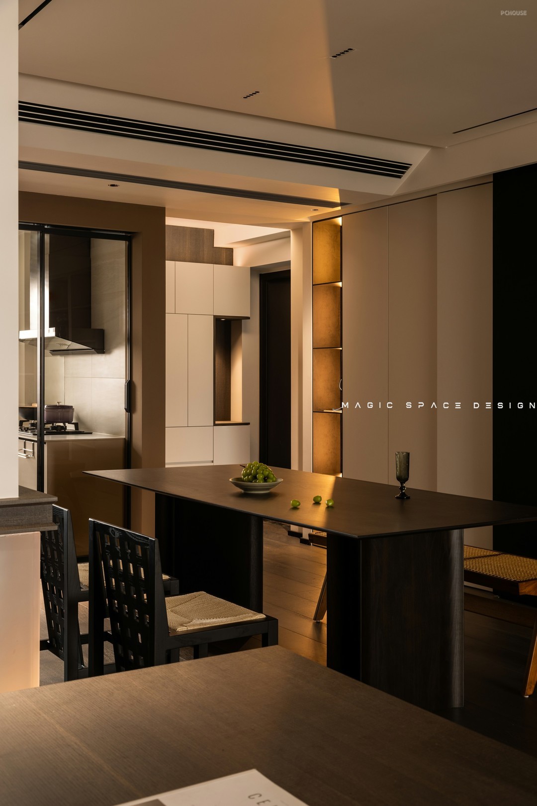亚克力材质携手暖光调和了立柱的生硬感,吧台紧跟其上创造灵动而稳定的错落层次,为厨房划分出了多个透气图景。黑胡桃色家具,充满艺术美感。不同大小的镂空造型,对话细腻的编织肌理,彰显质朴感与纯粹感。