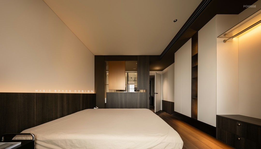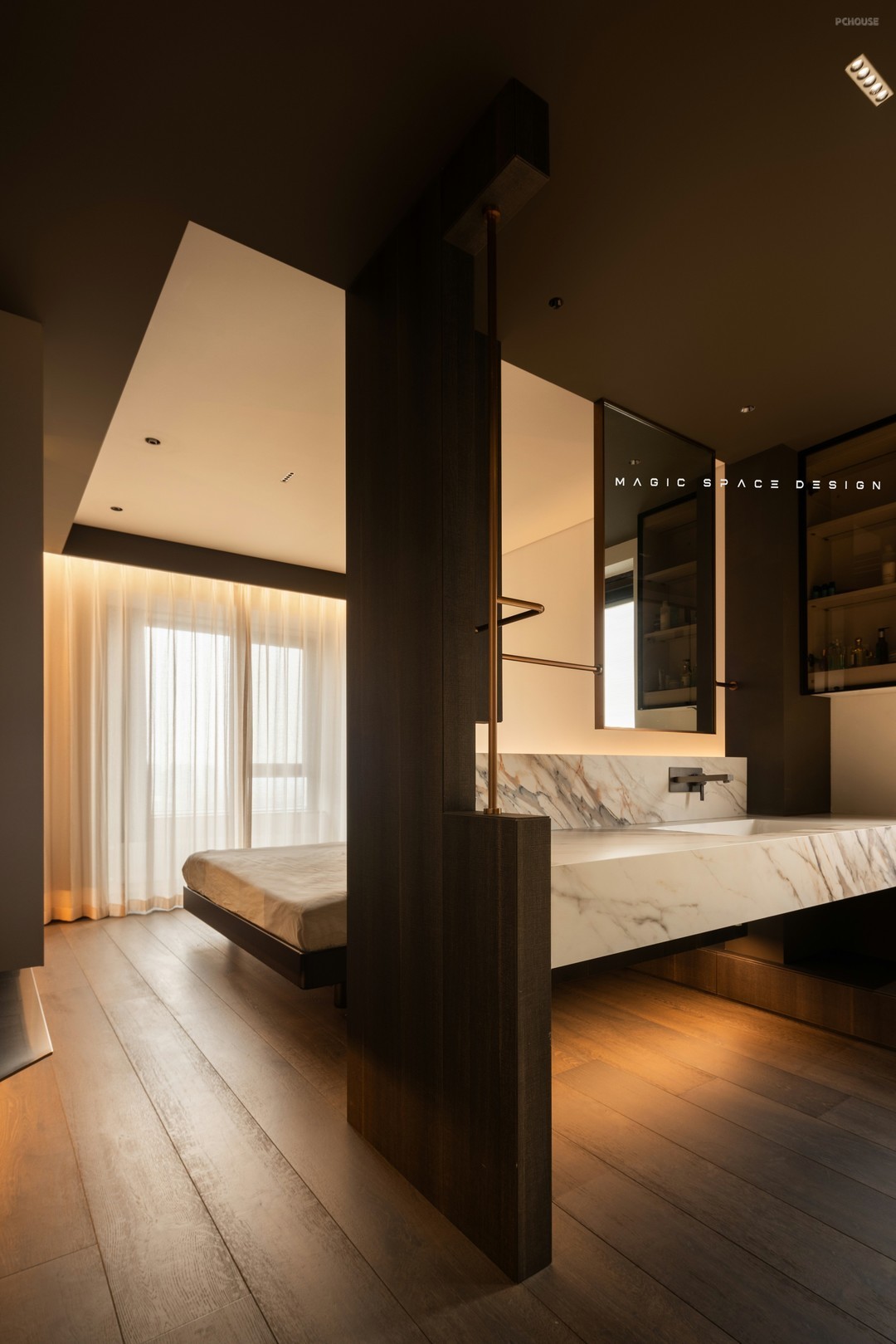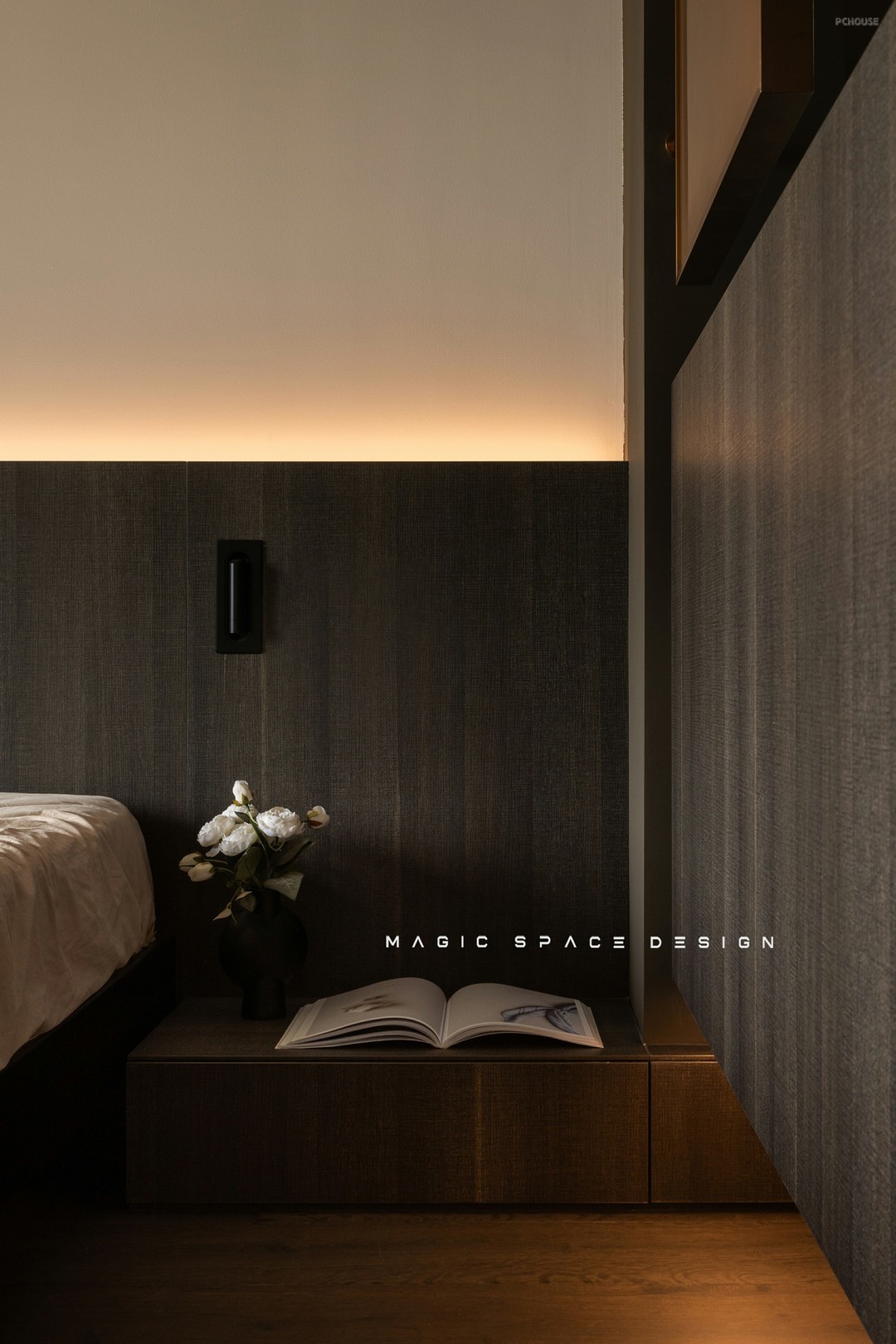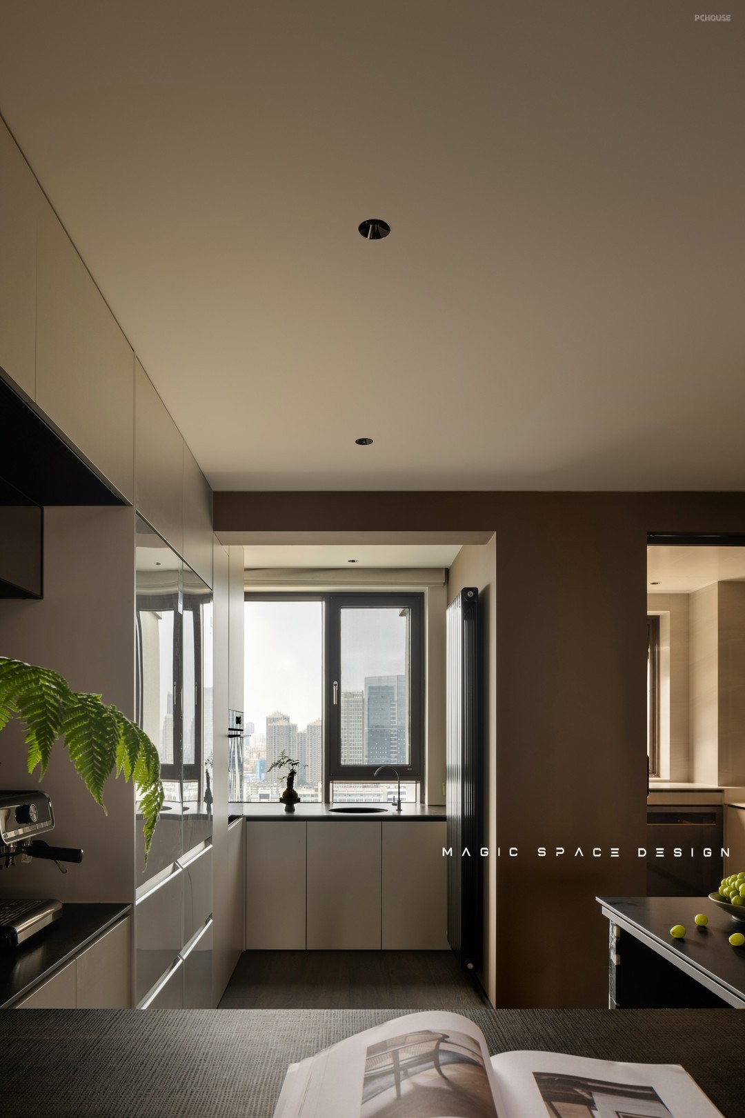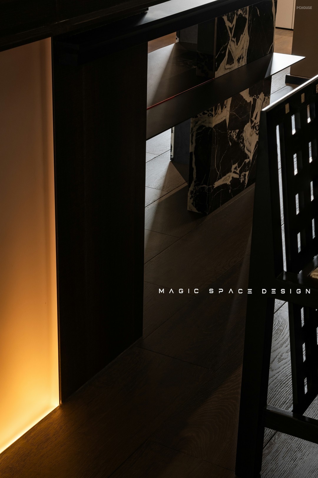 亚克力材质携手暖光调和了立柱的生硬感,吧台紧跟其上创造灵动而稳定的错落层次,为厨房划分出了多个透气图景。黑胡桃色家具,充满艺术美感。不同大小的镂空造型,对话细腻的编织肌理,彰显质朴感与纯粹感。