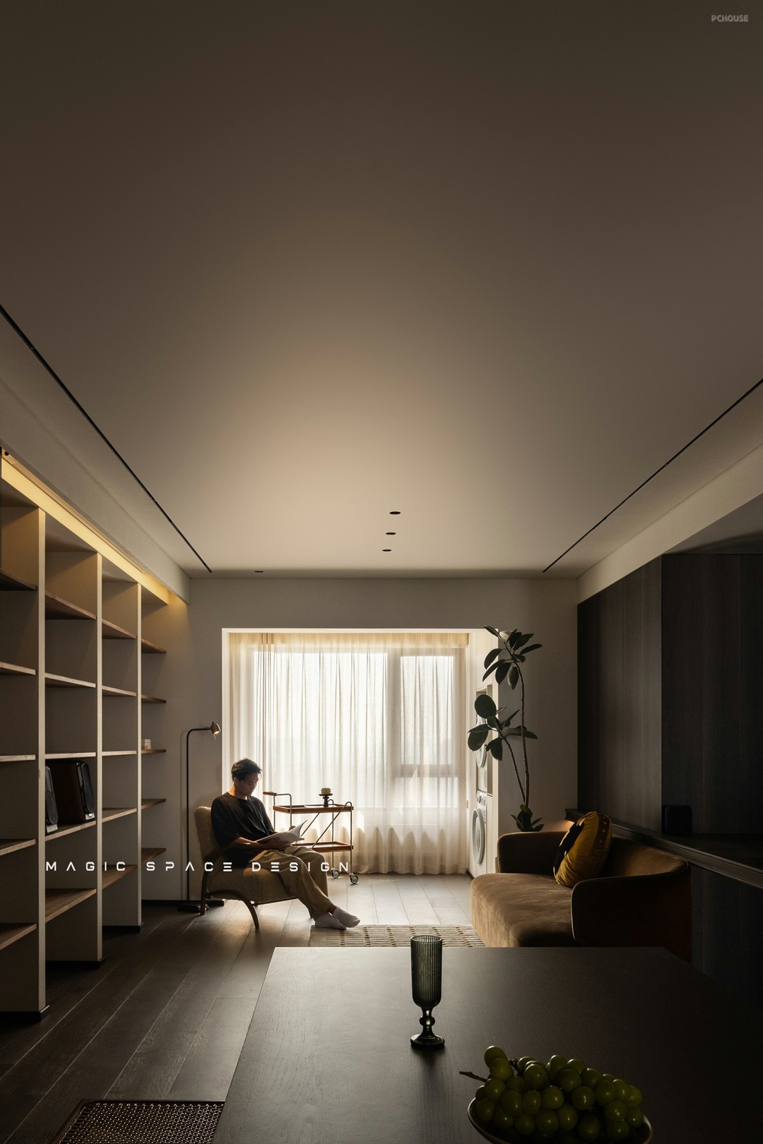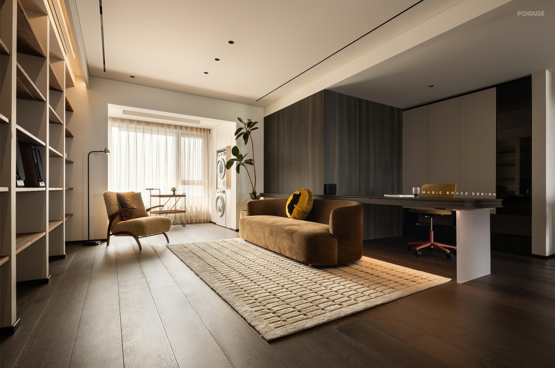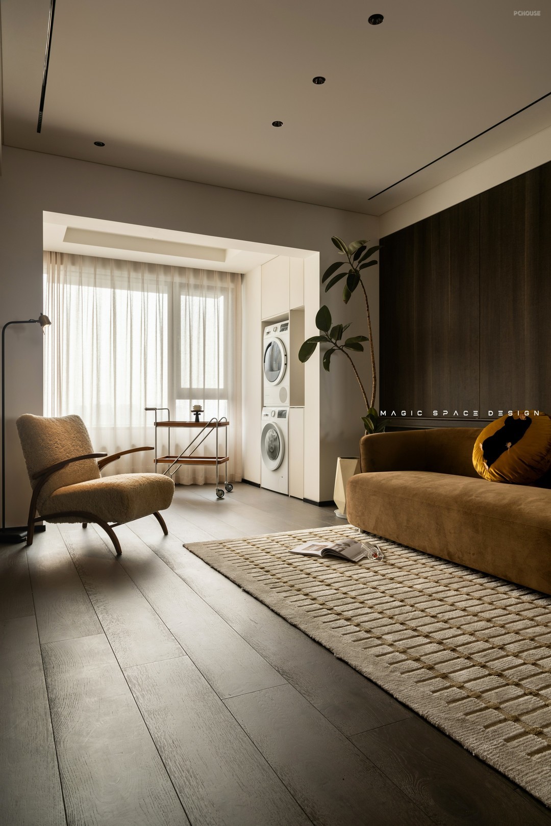 用具体的功能性布局,疏通人对每个场域的感知。阳台铺垫白净底色反射更多自然光,滋养空间深处,容纳洗衣功能,释放出规整的活动空间。复古跳色赋能优雅体块,与绿植相伴让人无限放松。开放式电竞空间背靠极简收纳系统,前接敞阔丰富的空间情态。