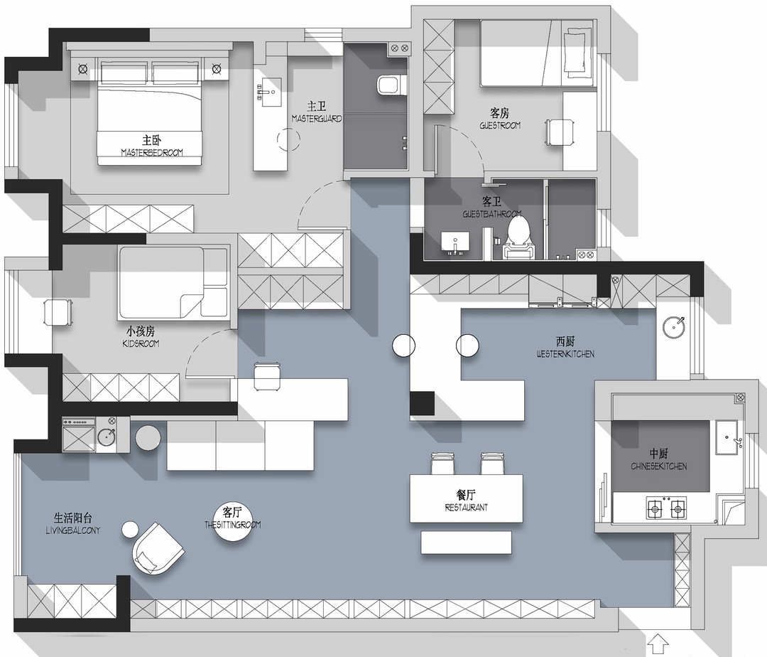 针对夫妻与幼子及偶尔来访的父母,设计聚焦于开放性和互动性,将传统四室简化为更加宽敞的三室布局。中心区域的创新——竖厅格局,借由阳台的融入,空间豁然开朗,围绕客厅中间的承重柱结构,做巧妙解构,延展空间的可能性,拓宽了餐厨空间,解决了原有餐厨过小的弊端。