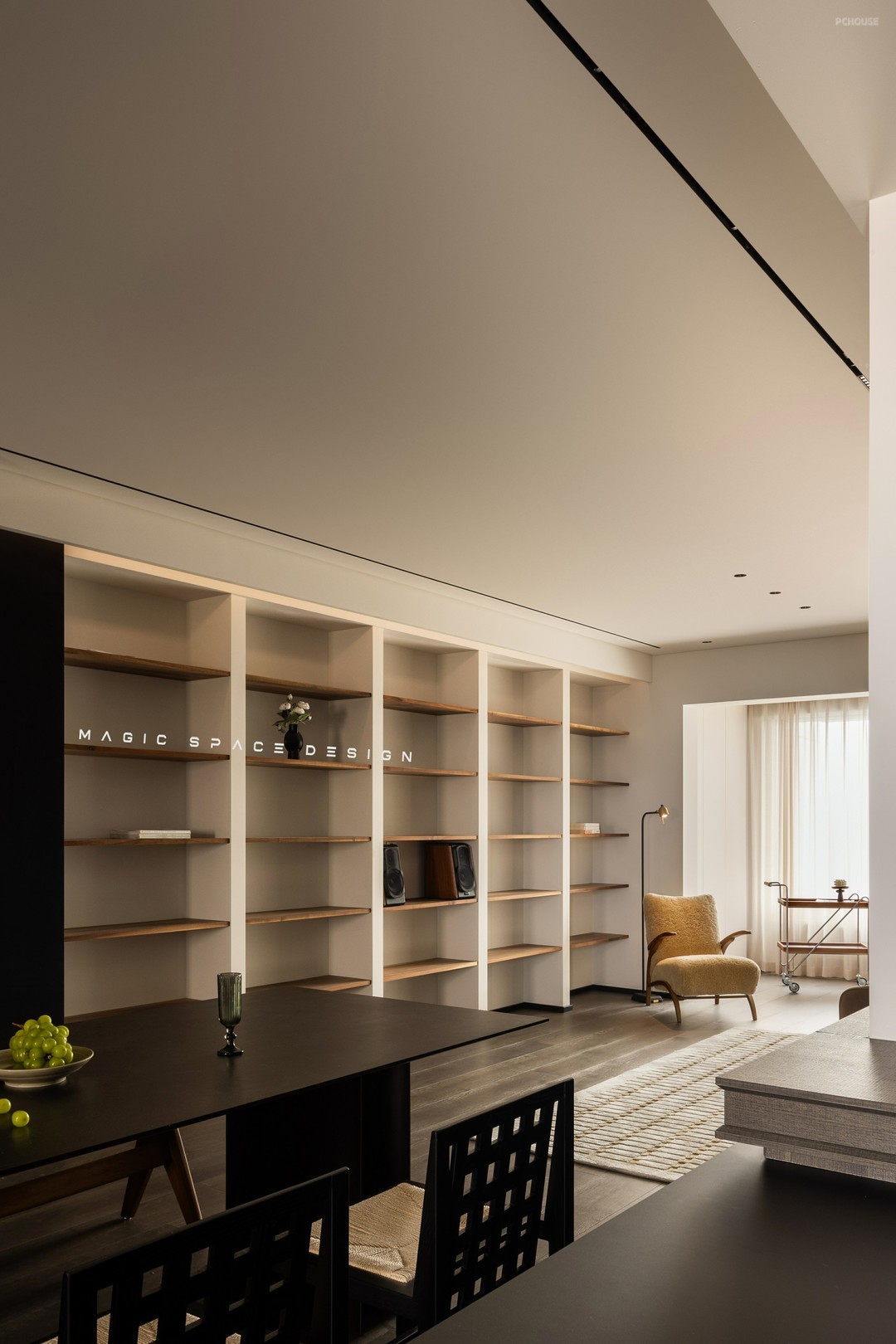 以“孩子的梦工厂”为概念设计宽幅书墙,爆改传统电视墙印象,沉淀出浓郁的书香气息。与书墙齐平的投影幕布暗槽,简约实用,引申出家人一起观影的幸福画面。创意黑板墙安置在书墙侧旁,交融情感价值与学习主张,给予孩子优质陪伴。