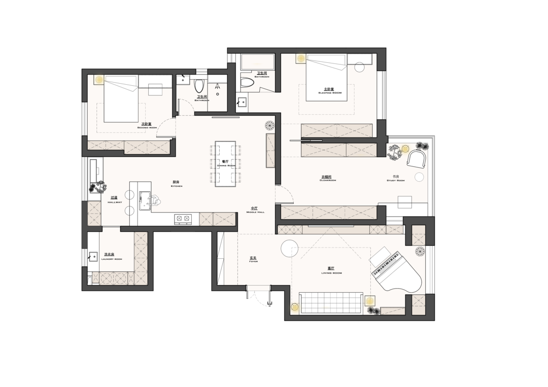 更重要的是通过精细的收纳规划来完善功能,引导动线,并起到空间界定和衔接的作用。具体将在以下实景图呈现中一一展开。