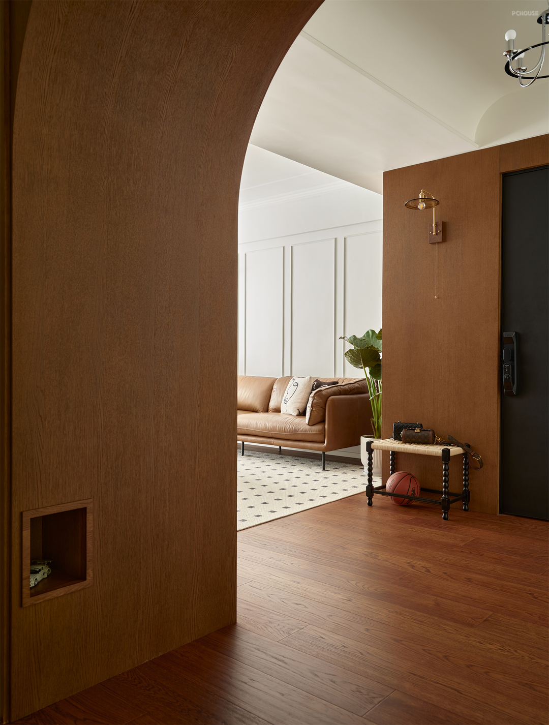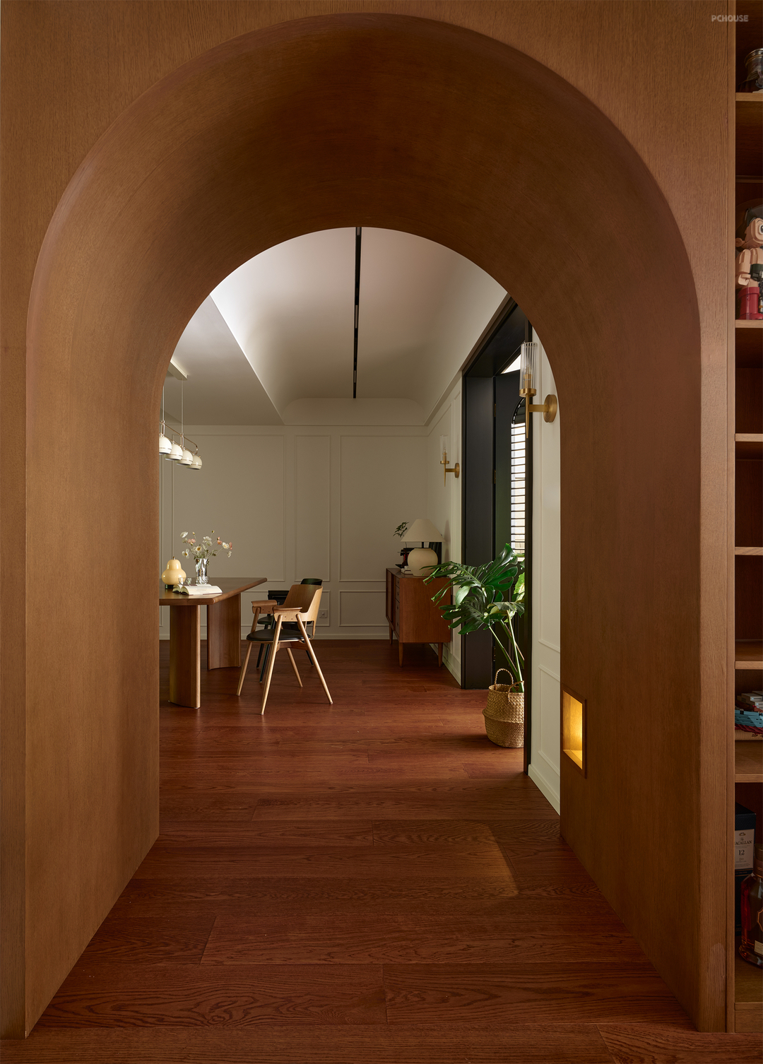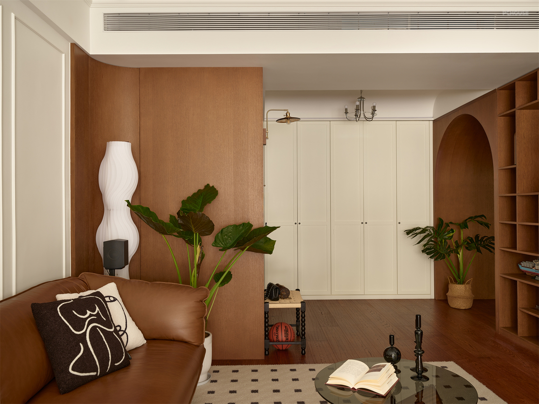 如果你把视野放大到整个屋子就会发现,我们分别通过拱形垭口和双开门的形式将东西向和南北向空间串联,巧妙营造空间的流动性和秩序感,奠定家的有序从容!