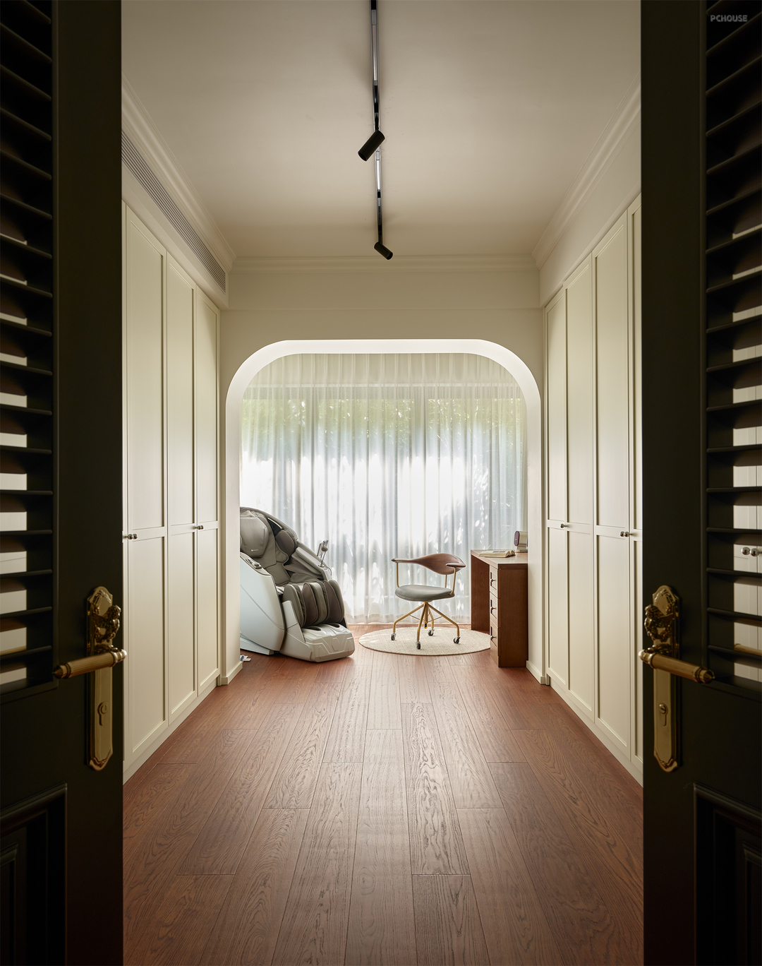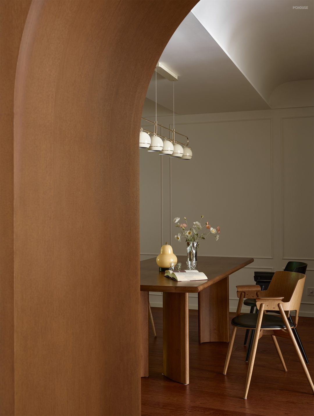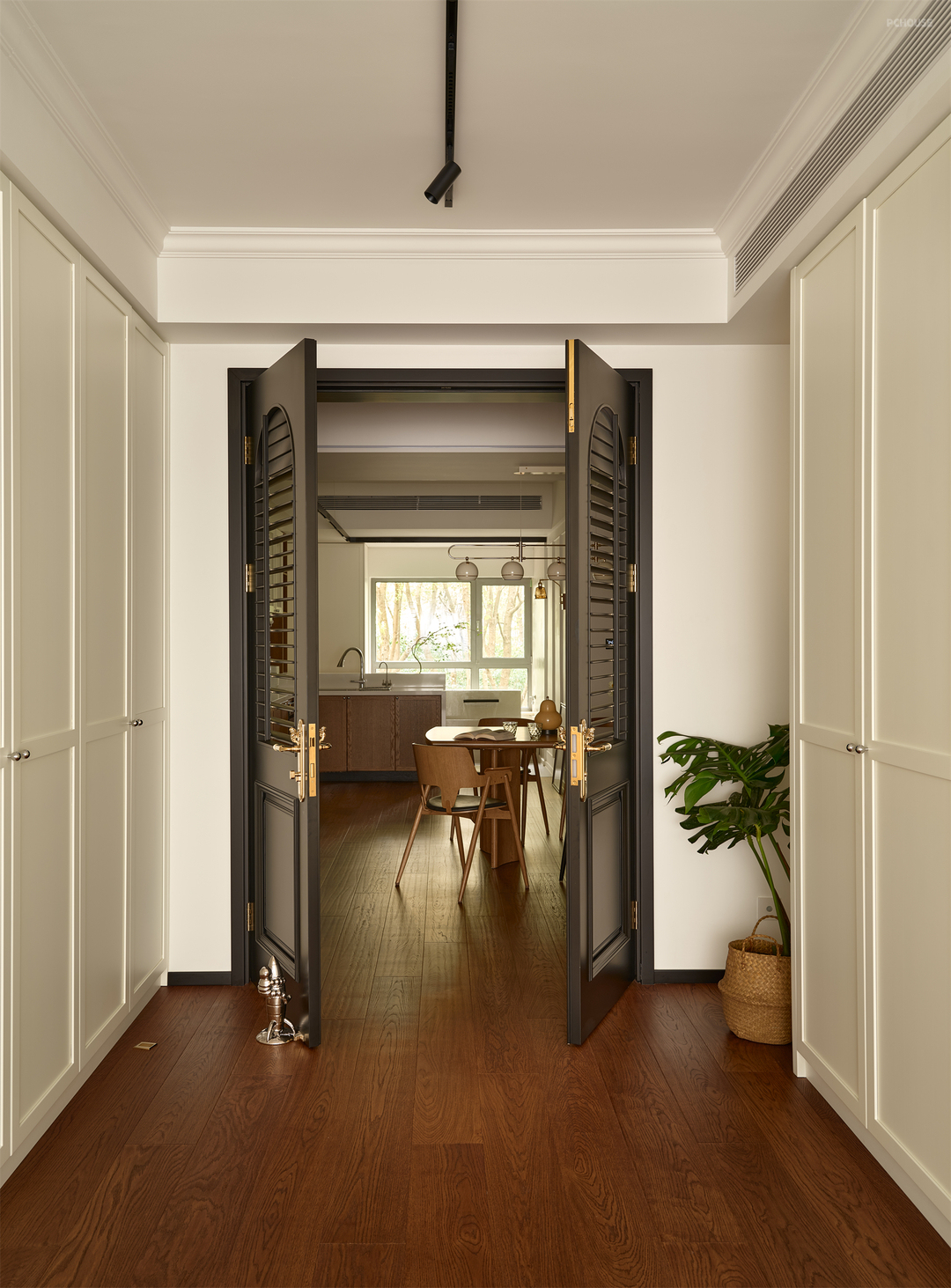 如果你把视野放大到整个屋子就会发现,我们分别通过拱形垭口和双开门的形式将东西向和南北向空间串联,巧妙营造空间的流动性和秩序感,奠定家的有序从容!