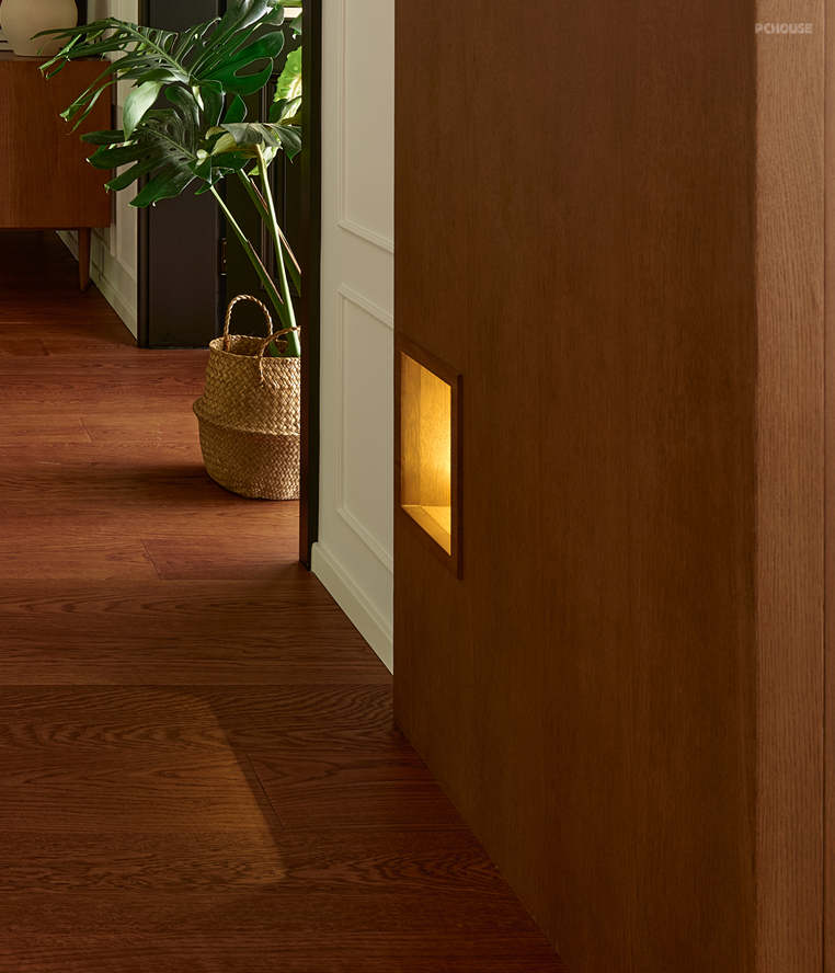 通过木饰面将部分梁体和墙面包裹,形成视觉整体,强化垭口结构体量感,进一步界定门厅区域,赋予玄关/客厅-餐厅空间柔和过渡的同时,解决了两侧墙体错位及柜体和墙面之间侧面收口的问题。