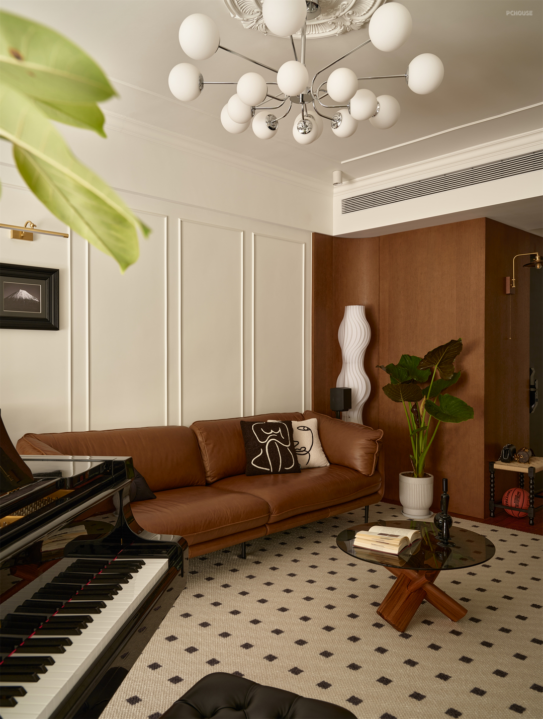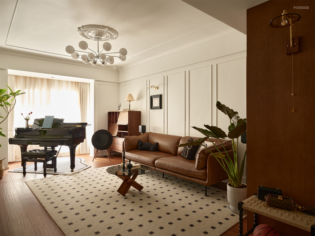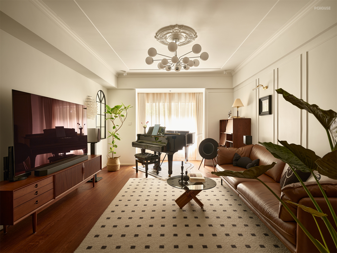 客厅阳台闲置空间被利用,引景入室,搭建起一个以香樟树为背景的钢琴演奏区。