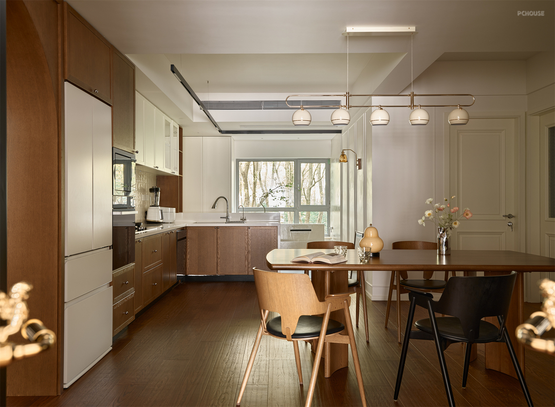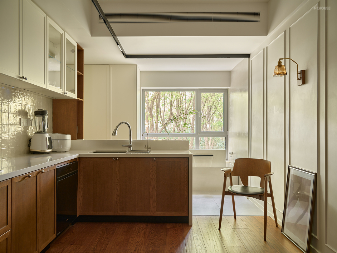 水槽这面橱柜特地设计成错层形式,结合吧台功能,既方便烹饪时亲友互动,也方便观景小酌,空间链接带动情感联结,诠释着人间烟火的温暖叙事。