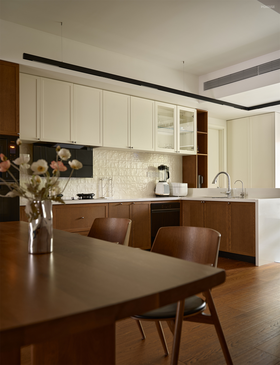 厨房移门拆除,改造成餐厨一体的形式,放大空间通透感。