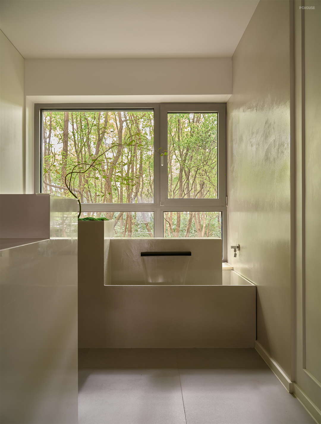 临窗区域契合整体风格做了流动水景,结合盆栽,和窗外绿荫形成呼应。