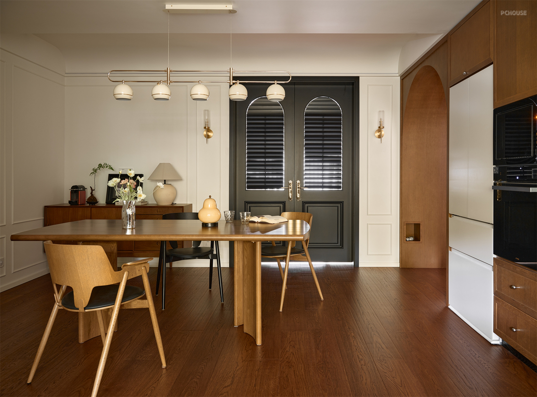 餐厅区域位于整个屋子中心,被多个门洞围绕。将主卧和书房的门洞合二为一,改成黑金复古双开门形式,既烘托了复古氛围,也为餐边柜留出摆放空间。