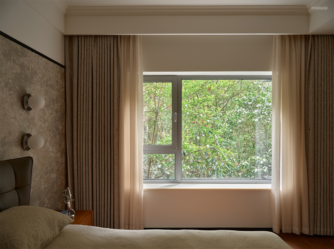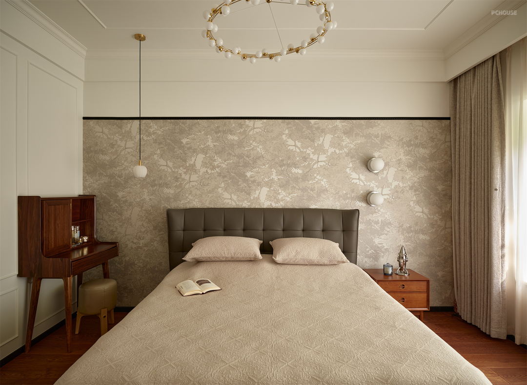 主卧绝对是家里的一处视觉惊喜,复古风格强烈的背景墙处理不只丰富了视觉层次,也为卧房增添了更多自然柔美氛围,呈现出感性与个性并存的调性。
