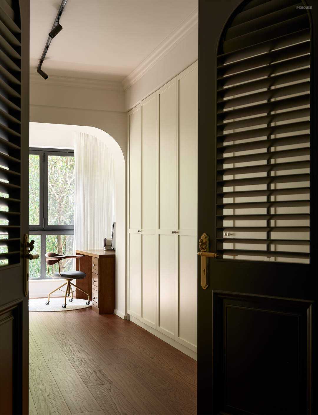 其次将主卧和书房门洞合二为一,变成一间带独立衣帽间的完整套房形式,并特意将衣帽间改成带可调节百叶的双开门形式,增进南北光线流转,拓展空间通透感。