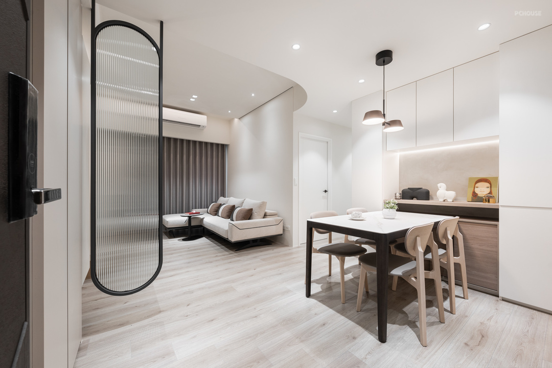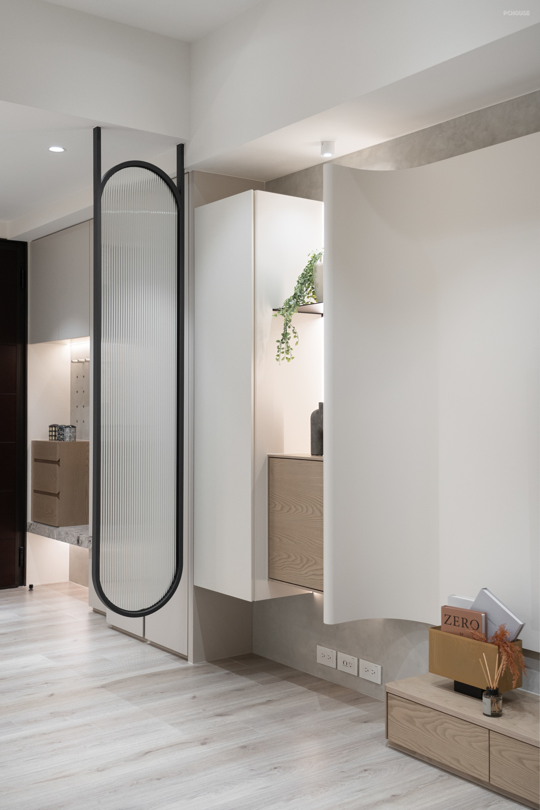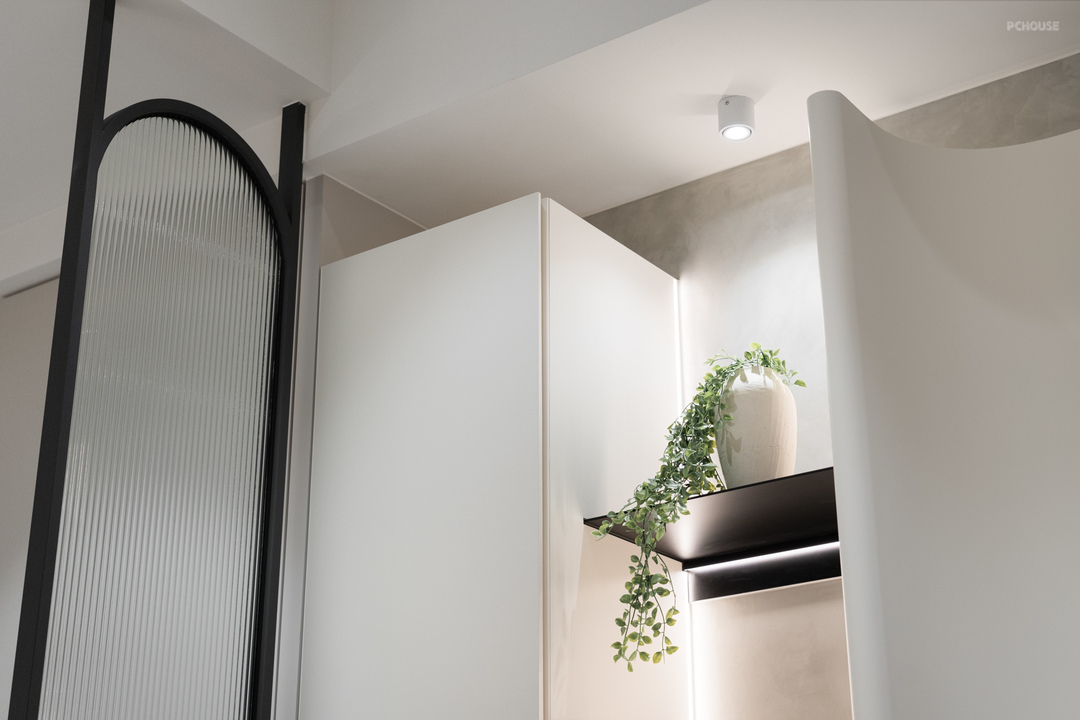 由于有开门见窗的风水考量,我们以铁件结合长虹玻璃做为屏风,并以倒弔固定的方式,将本就轻盈的量体再进一步弱化,营造出朦胧且通透,又不阻碍视线的效果。