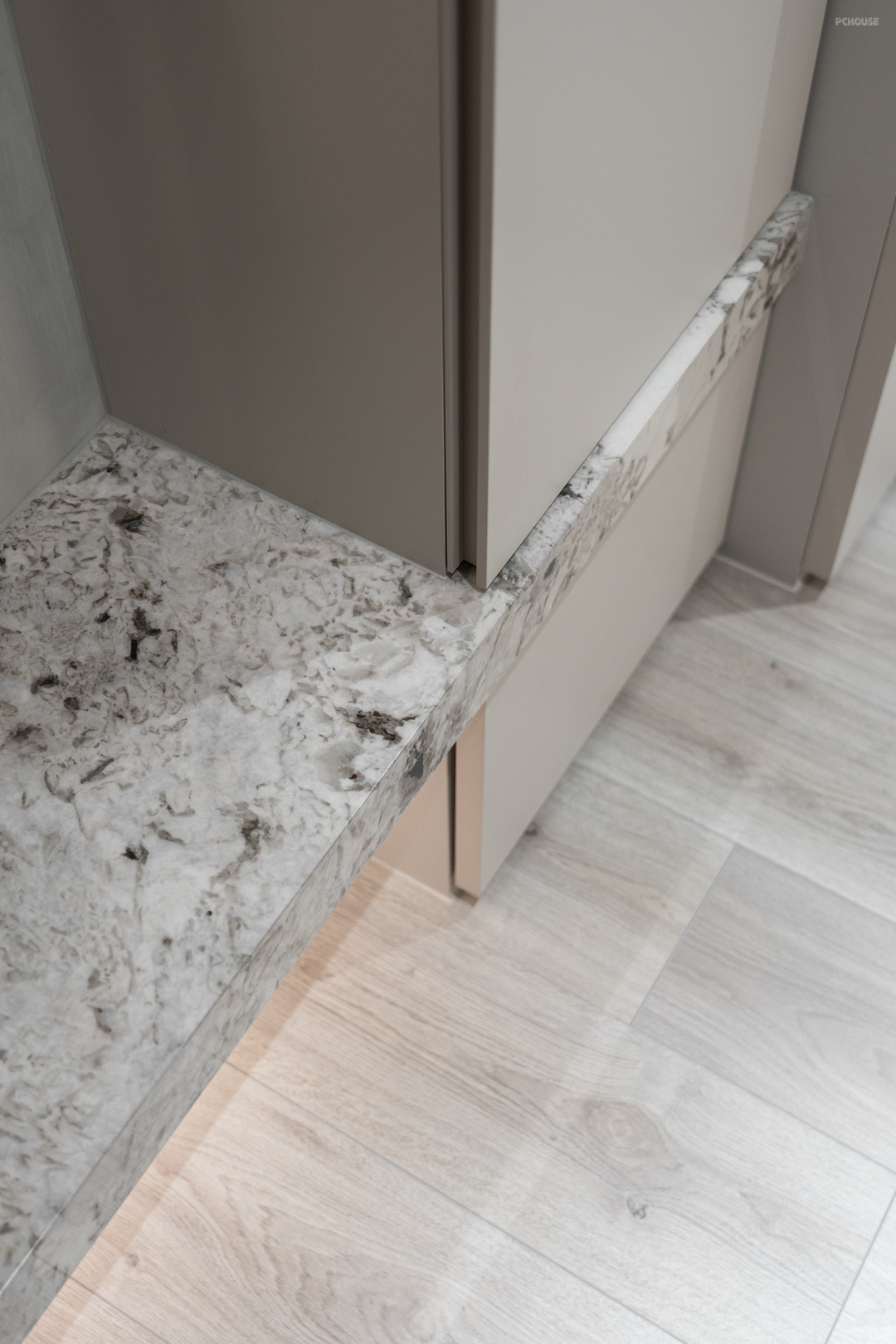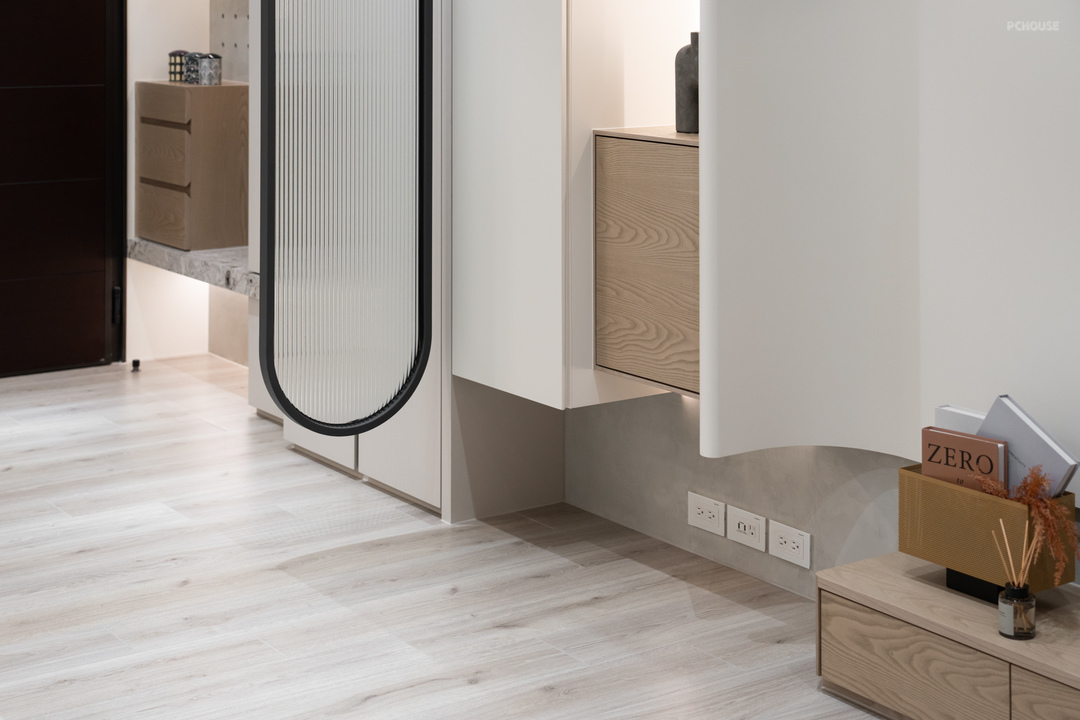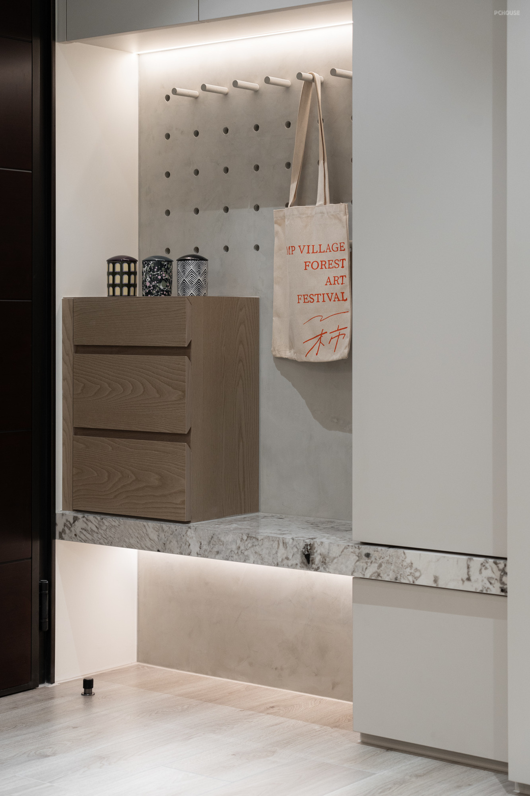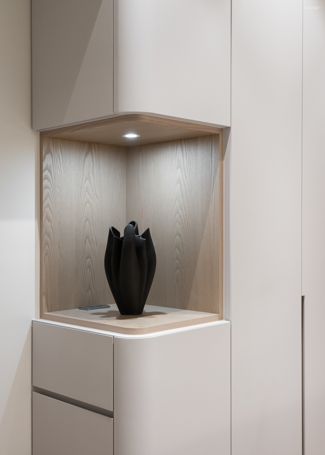 乐土的手感纹理与木质调的层板、门片相呼应,带出轻柔且和谐的气氛。