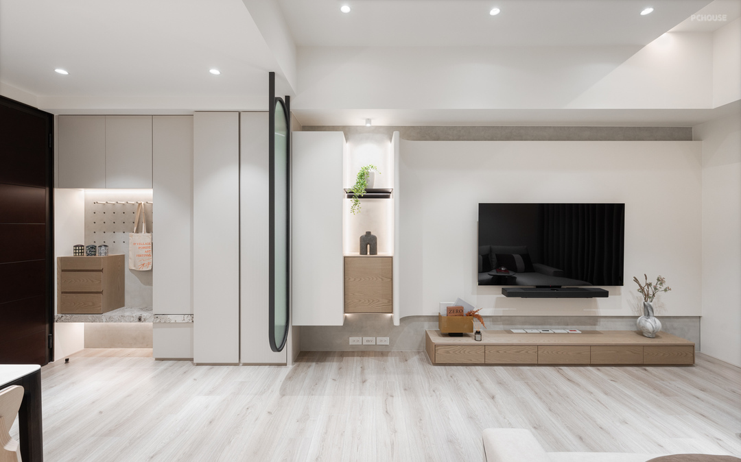 上下以乐土灰泥抹镘,并安排进退面深度,借由颜色的对比与距离的深浅,让造型电视墙显得悬浮而轻巧,延展视觉宽度感受。