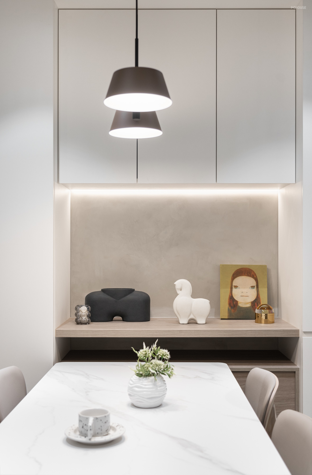 餐厅区边柜,两边高柜与弔柜围塑出的中间区域,以乐土灰泥施作背板。