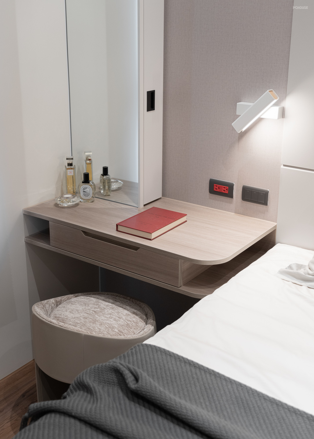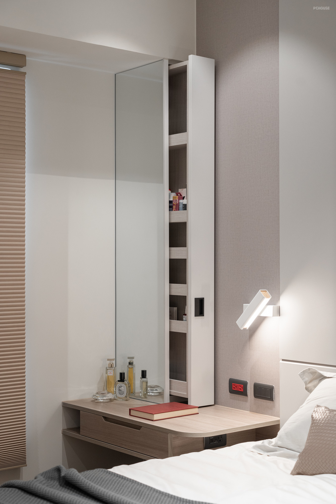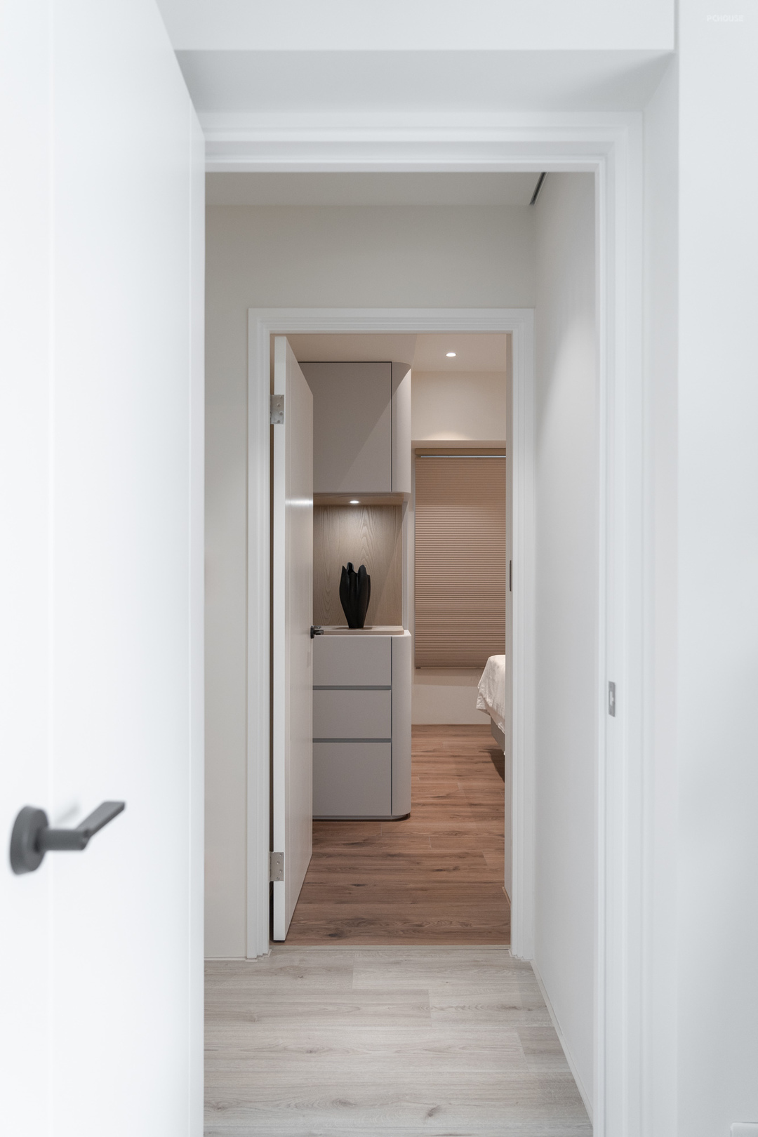 主卧室入门处的衣柜,结合了一个小平台。摆上香氛或喜爱的物品,创造仪式感的角落。