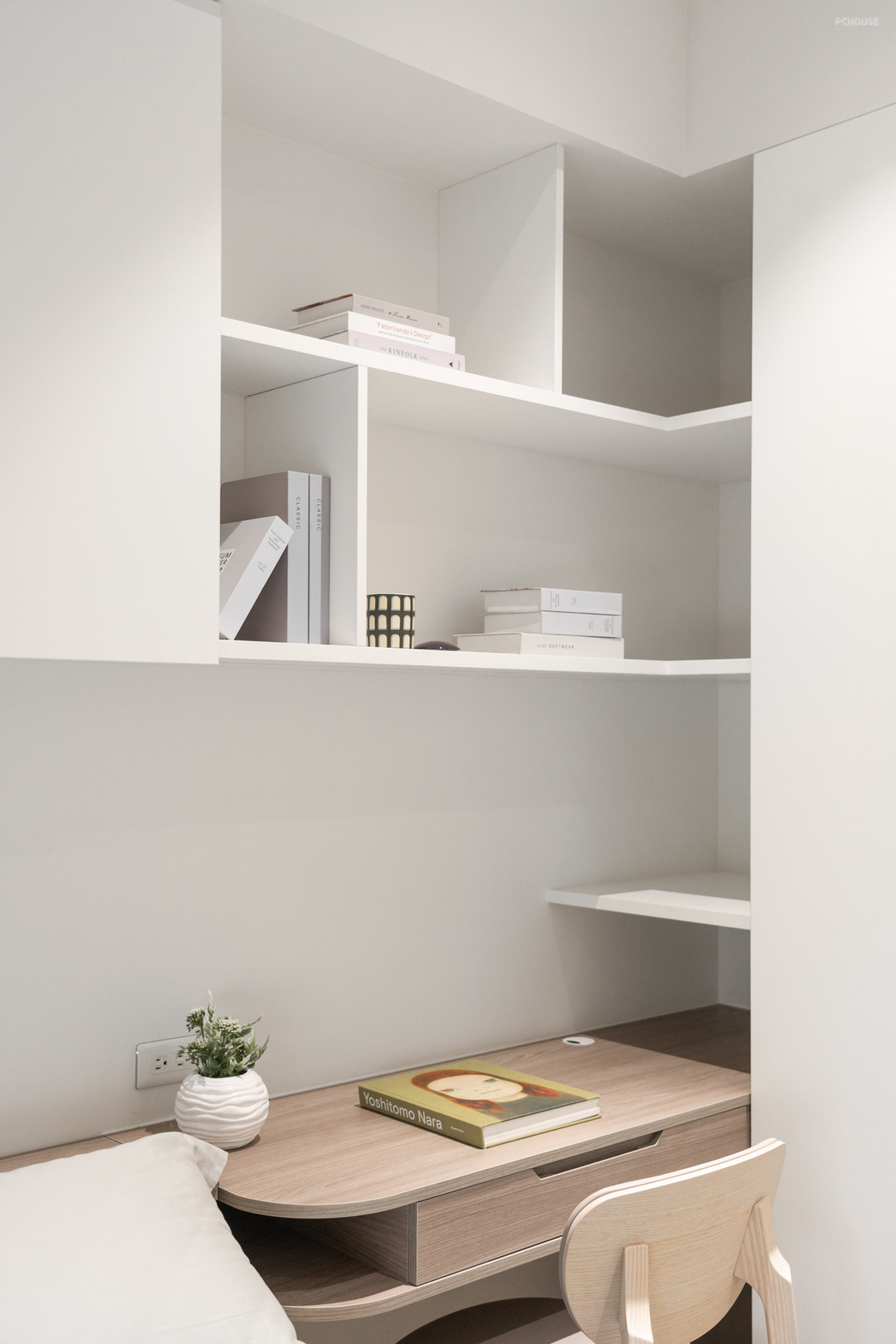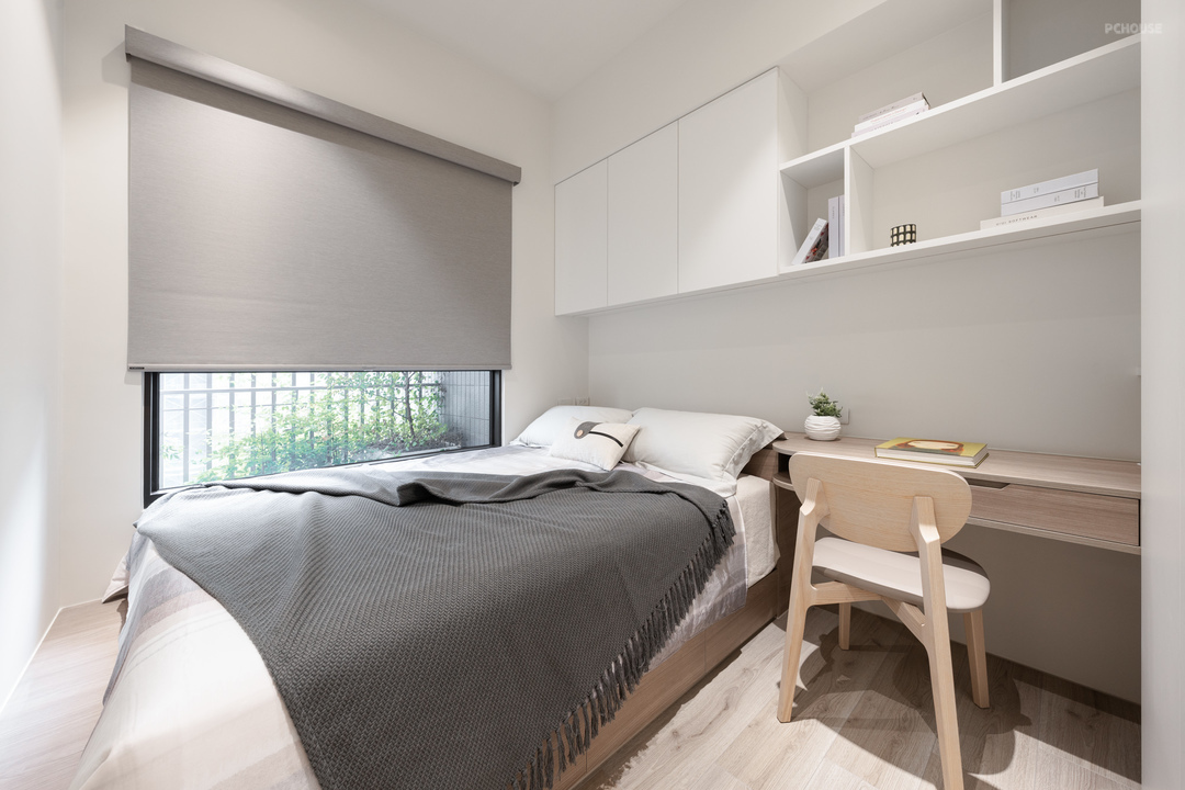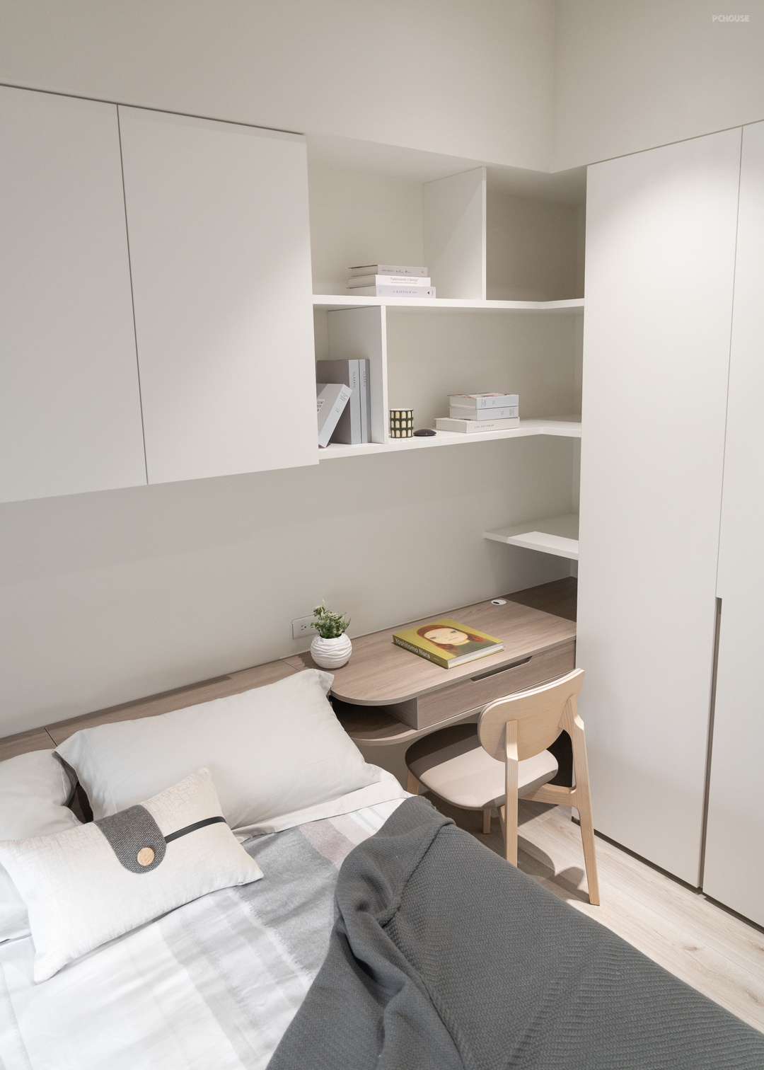 小孩房和客房,皆以床头上掀柜结合架高地板床架的方式,提升小空间的收纳效率;材质与色系也借此统一,给予更加宽敞的效果。