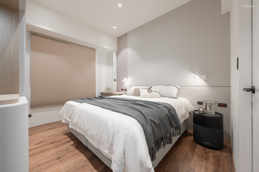 主卧室、小孩房和客房,延续公区色系,同样以木质调、白色、灰色,酝酿恬适的寝居空间。