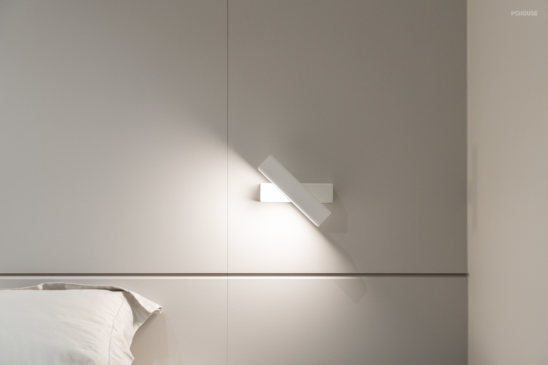 以系统板复贴的床头背墙,线条的分割、倒斜角,丰富了整体层次。