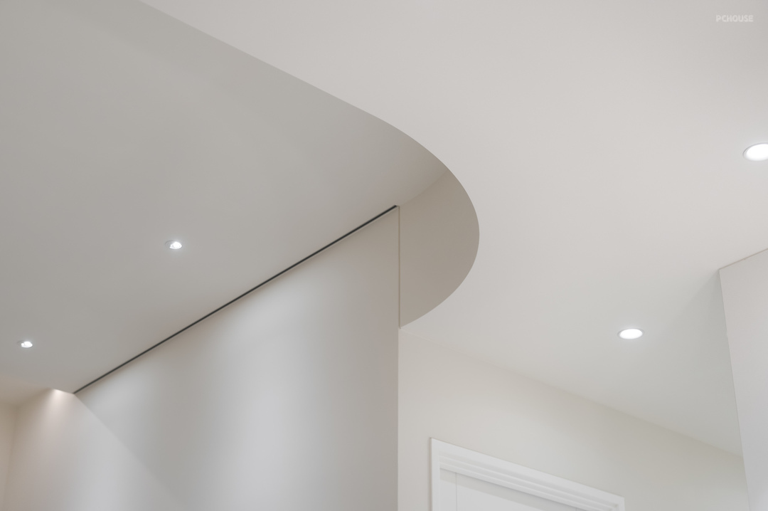 开放式收纳柜的侧边,以弧形电视墙做收尾。
