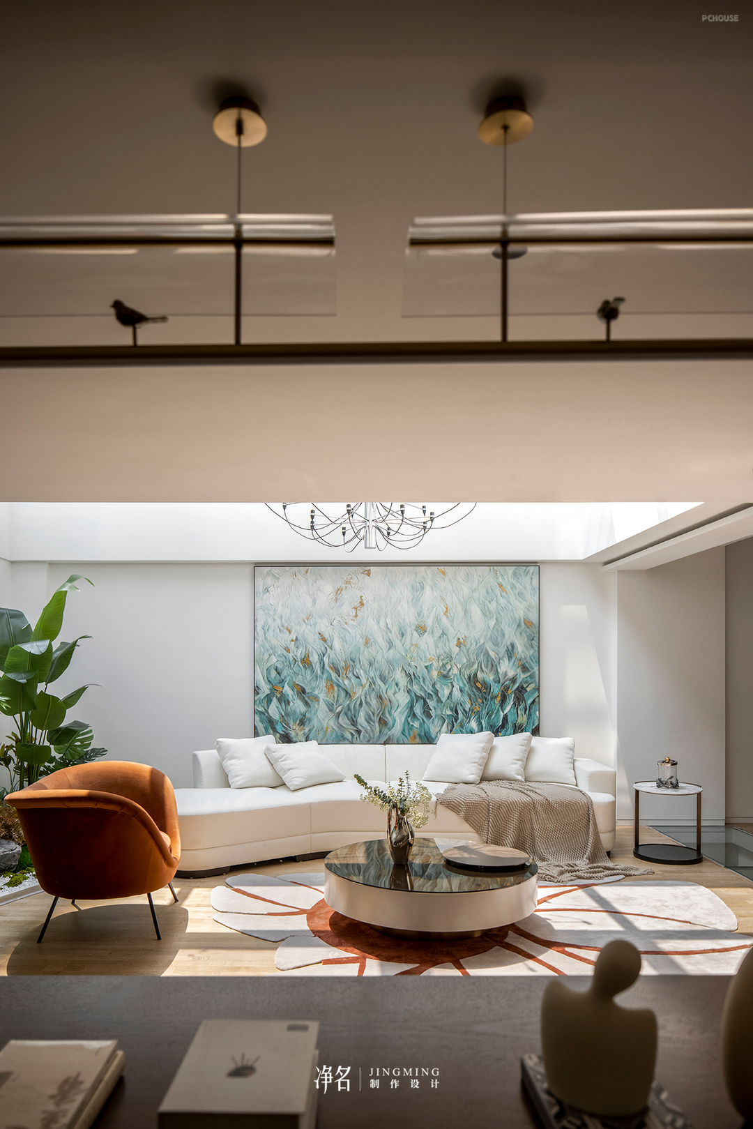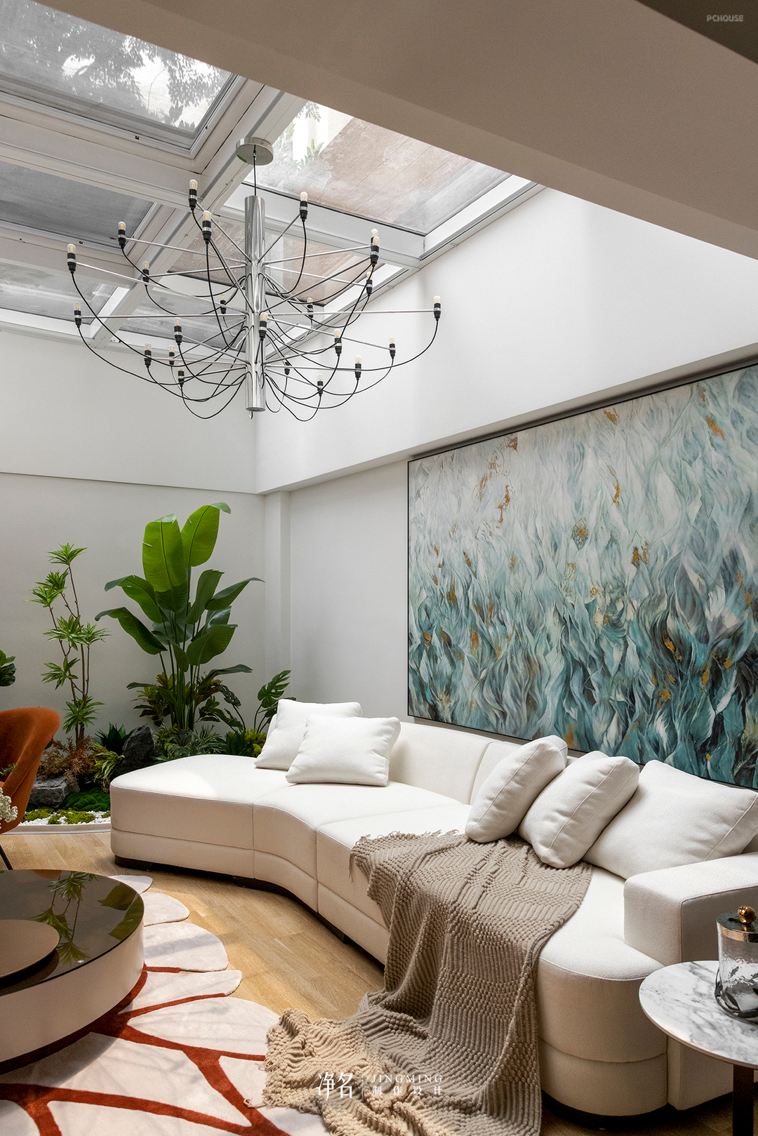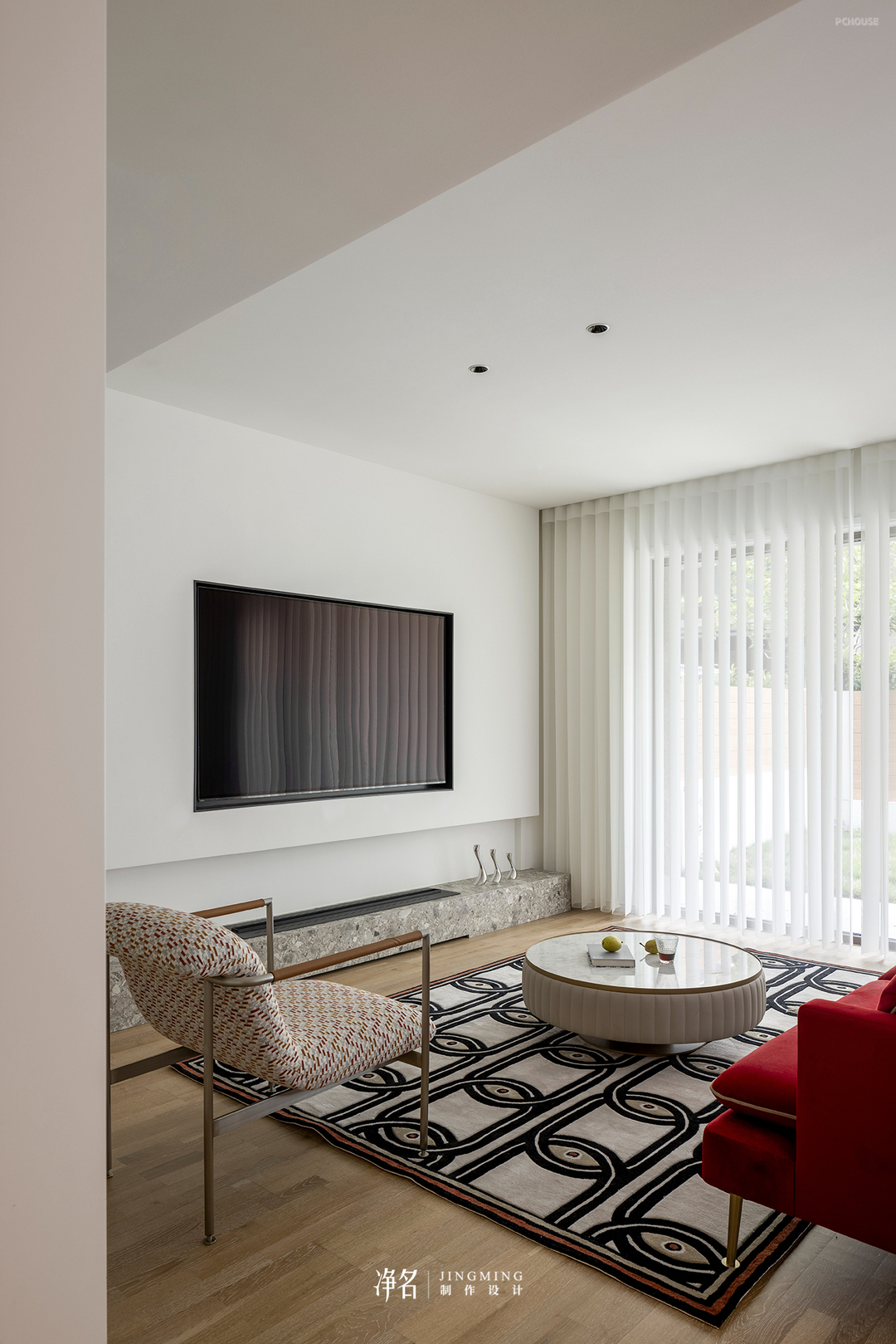 我们接手时,别墅硬装已经完成,原来装修时硬装做了现代极简风格。硬装完工后业主发现,现代风格在用于直播或者招待朋友时,显得过于简洁和单调。所以,软装上业主期望在房子中增添一些出彩的家具和颜色。