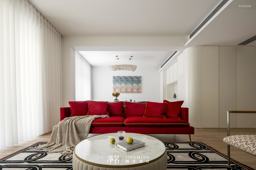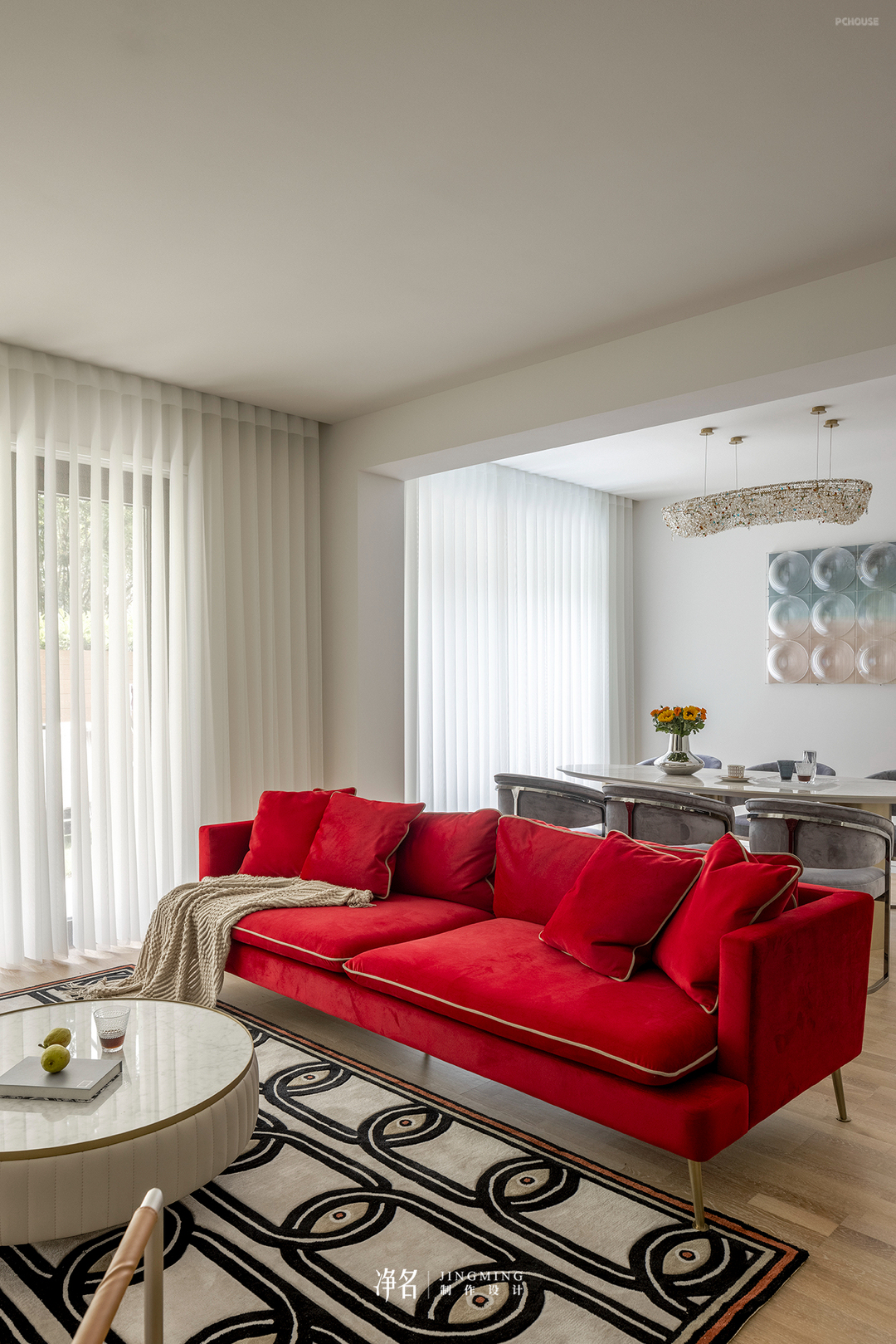 复古与现代交织,混搭风别墅的独特魅力。客厅硬装基地以米白色为主色调,软装搭配大红色的进口绒布沙发,质感十足。现代轻奢圆形茶几与现代简约相得益彰,地面铺设的几何图案地毯增添了活泼感。沙发背后的亚克力凹凸面镜抽象装饰画挂在餐厅墙上,成为视觉焦点,让整个空间充满了文化底蕴。