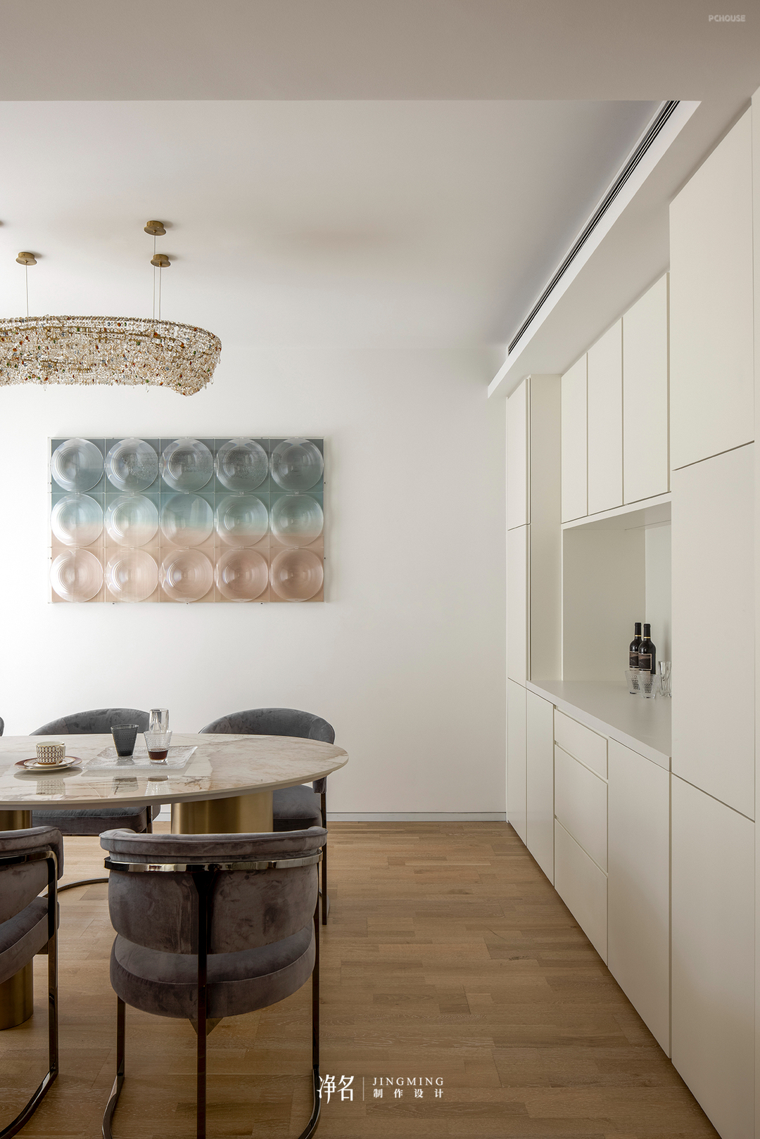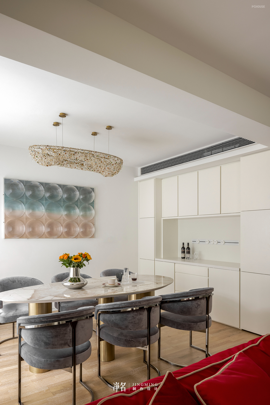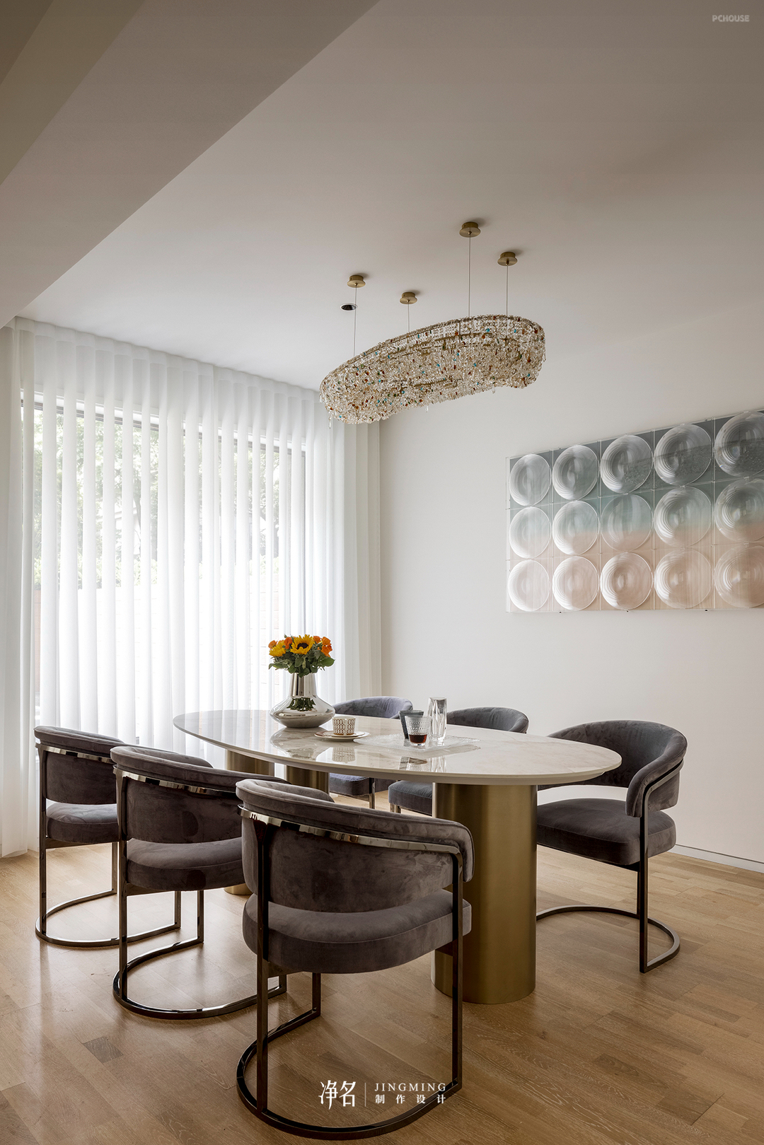 餐厅软装以黑色与灰色为主色调,尽显奢华。椭圆形的餐桌搭配真皮蓝色餐椅,充满意识复古气息。水晶吊灯璀璨夺目,照亮了整个空间。餐桌上的精致餐具和银质的花瓶,彰显出主人的品味。