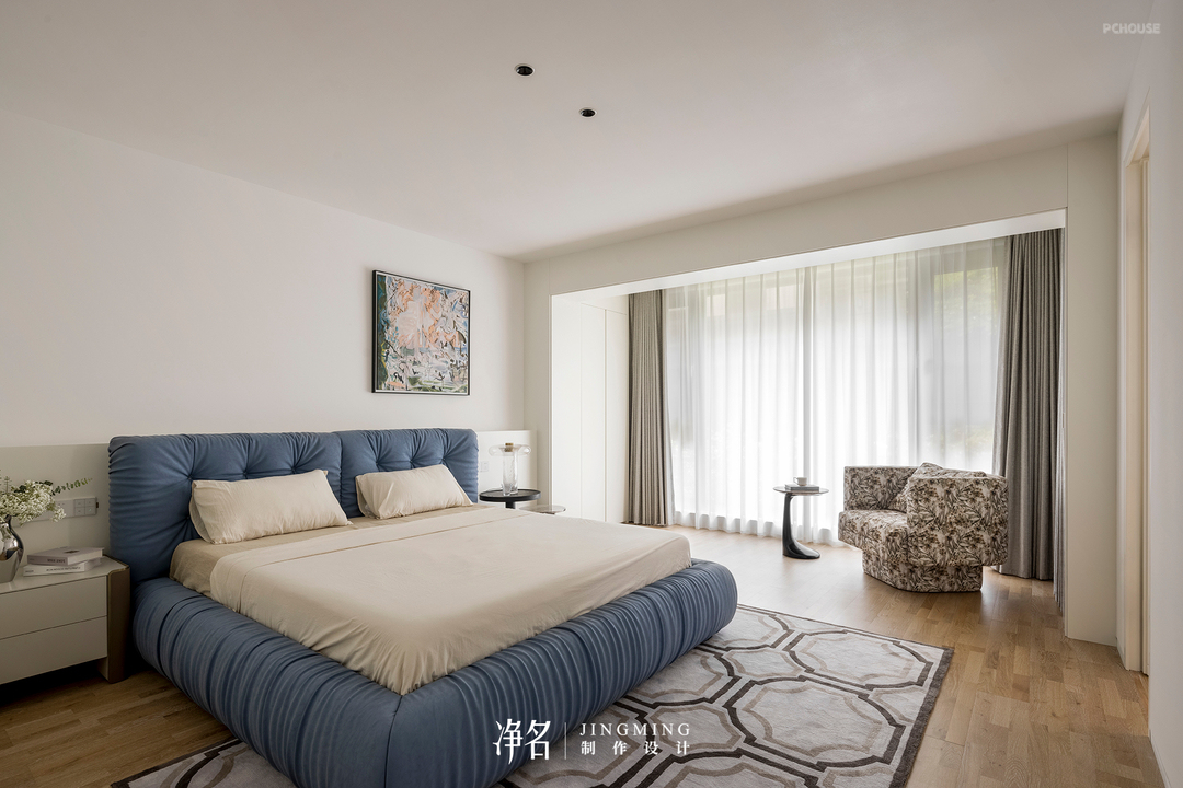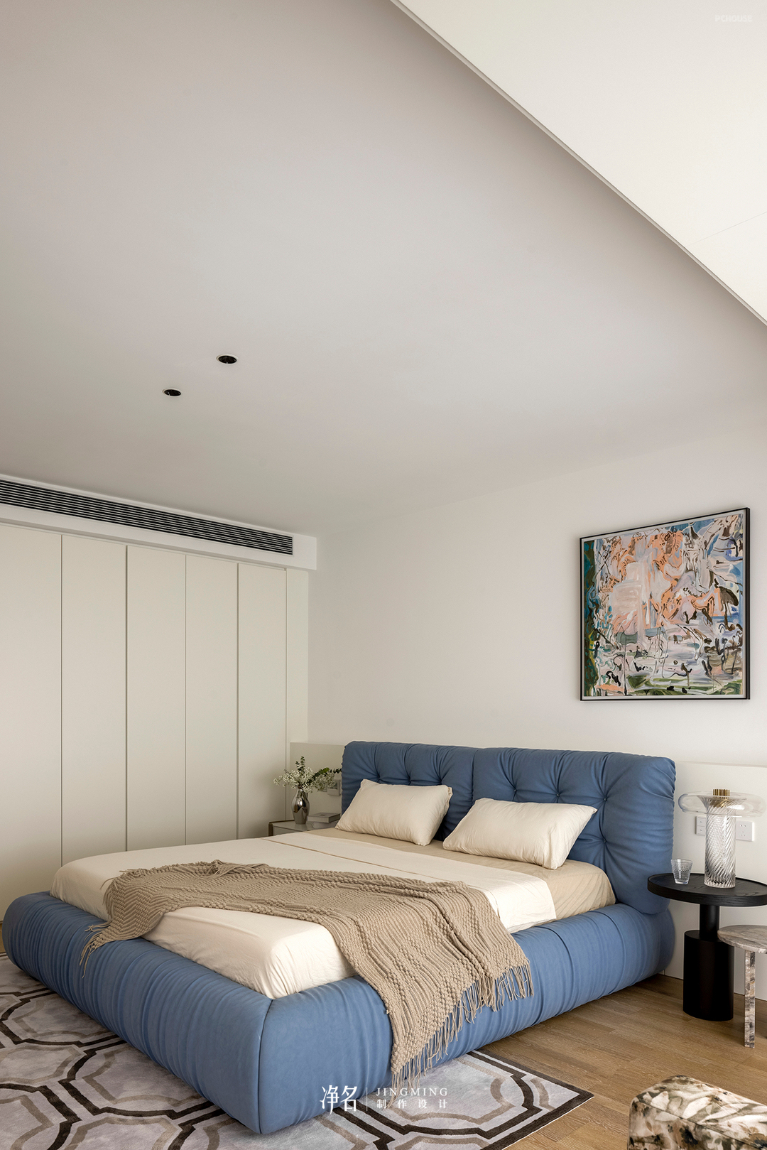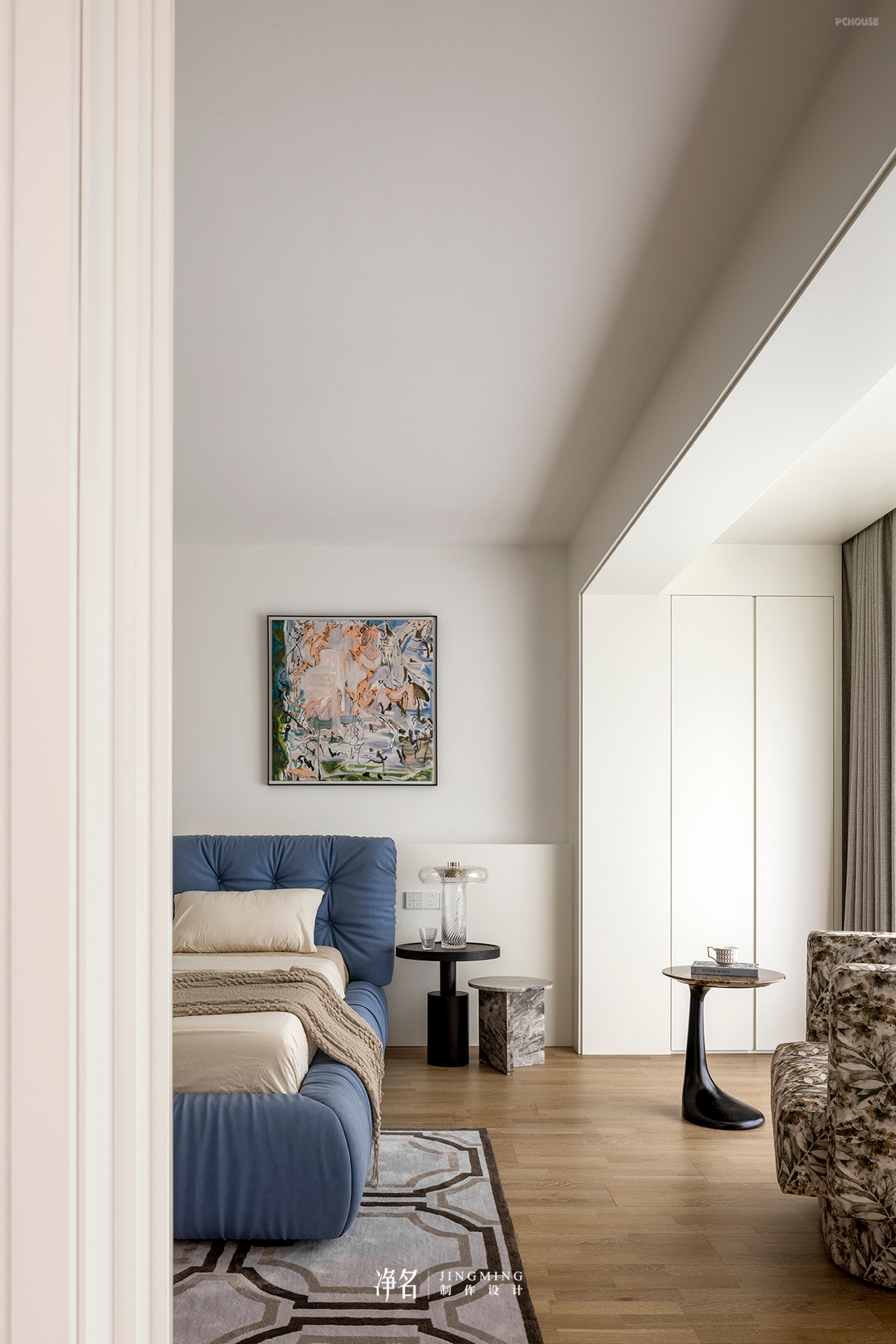 卧室床以淡蓝色为主,营造出宁静的氛围。柔软的床品搭配云朵布艺床,给人舒适的感觉。窗帘采用轻薄的纱质材料,让阳光柔和地洒进房间。文艺复兴时期的装饰画和提花刺绣休闲单人椅,为卧室增添了浪漫的氛围。