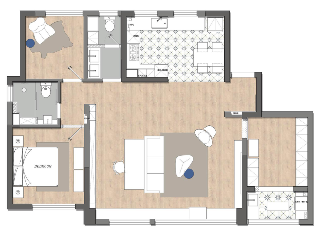 这个家是男女业主双人居住,在房间分配上没有保留客房,东南次卧作为衣帽间+家政区使用,北次卧则用于日常休闲,所以家中包括客卫干区、餐厨、衣帽间等尽可能以开放的姿态面向公区;