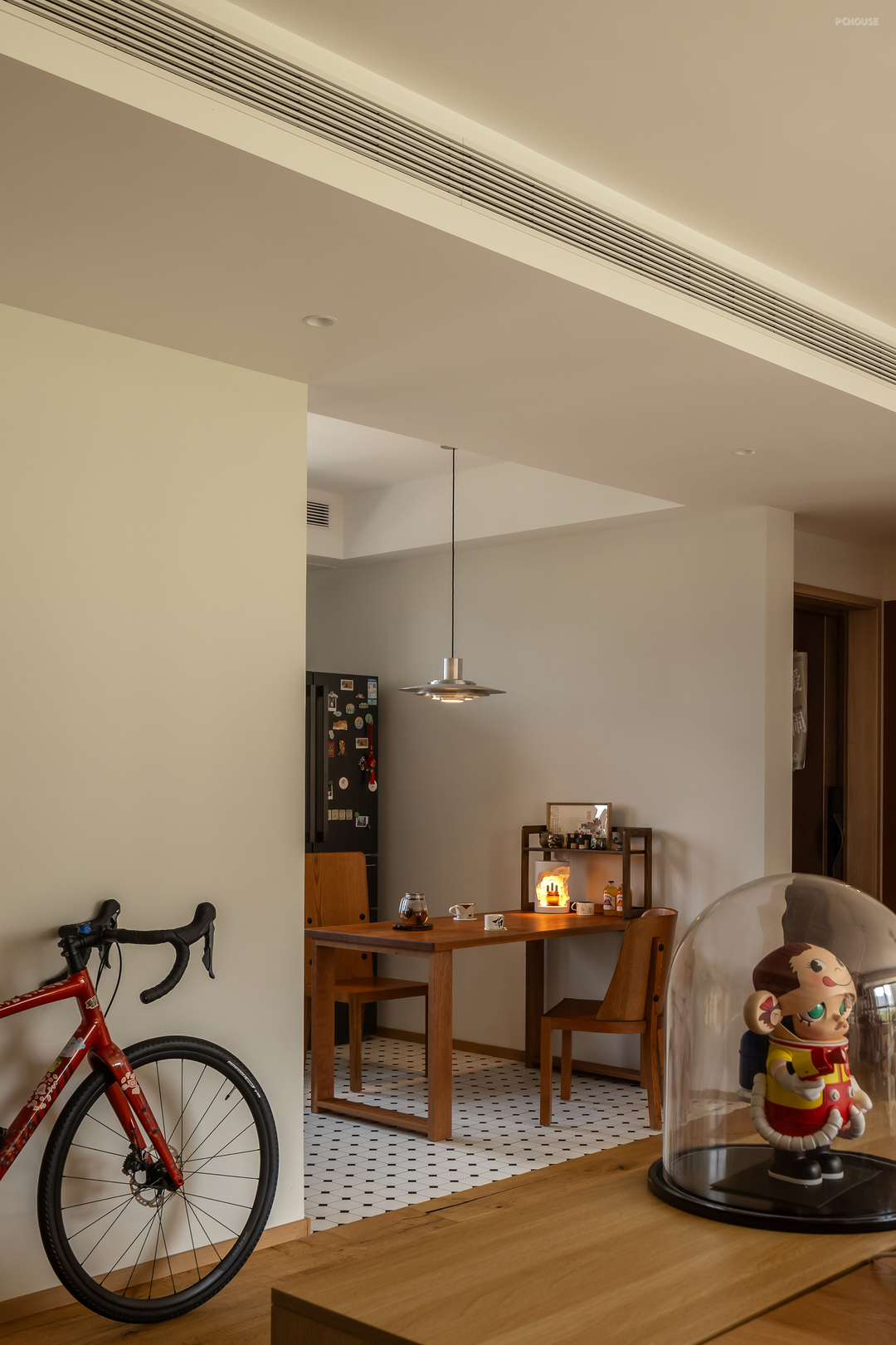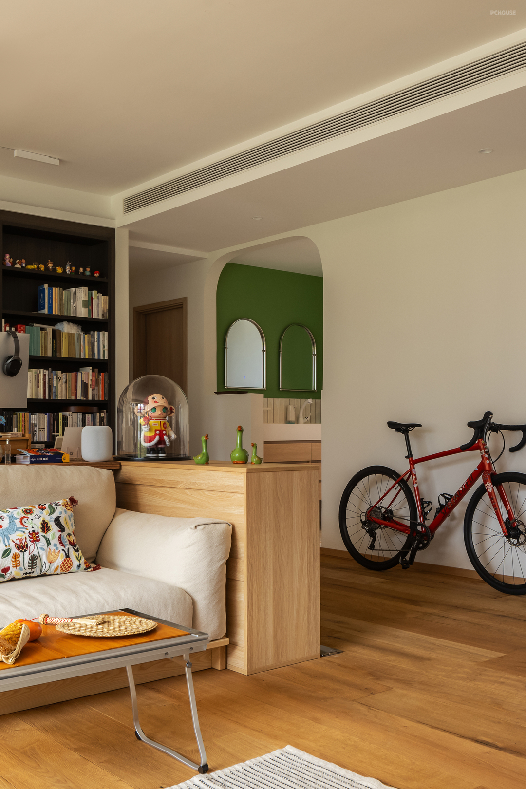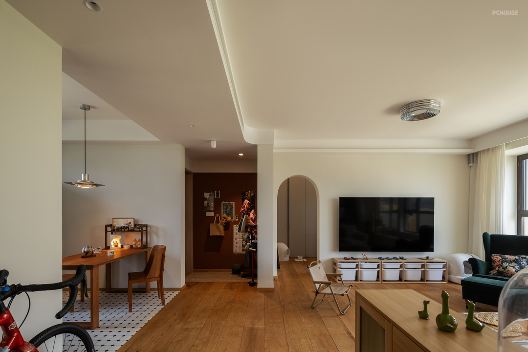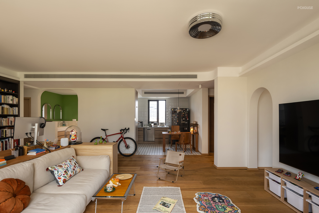 自行车就很随意的放在客厅,如果这时候骑上一圈,都是很有趣的,次卫同样是造型门洞的设计,半开放式的操作区,可以让空间更开阔,也便于后期机器人清理卫生。