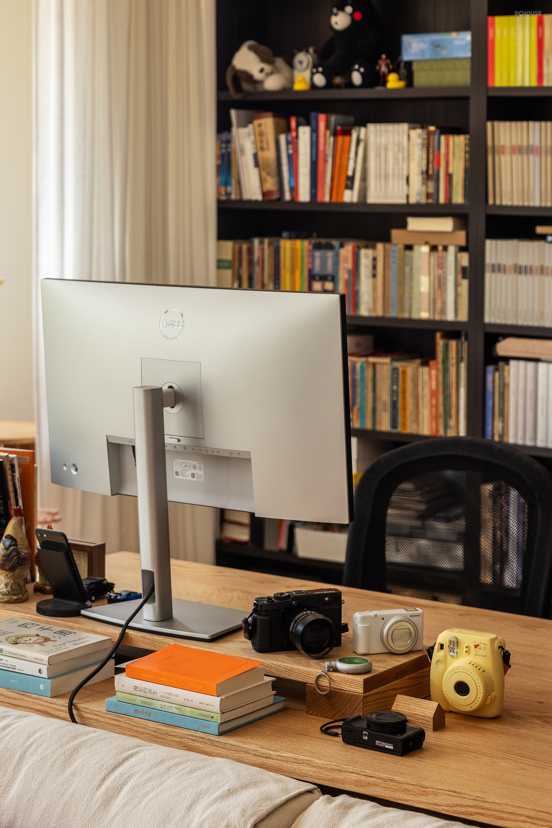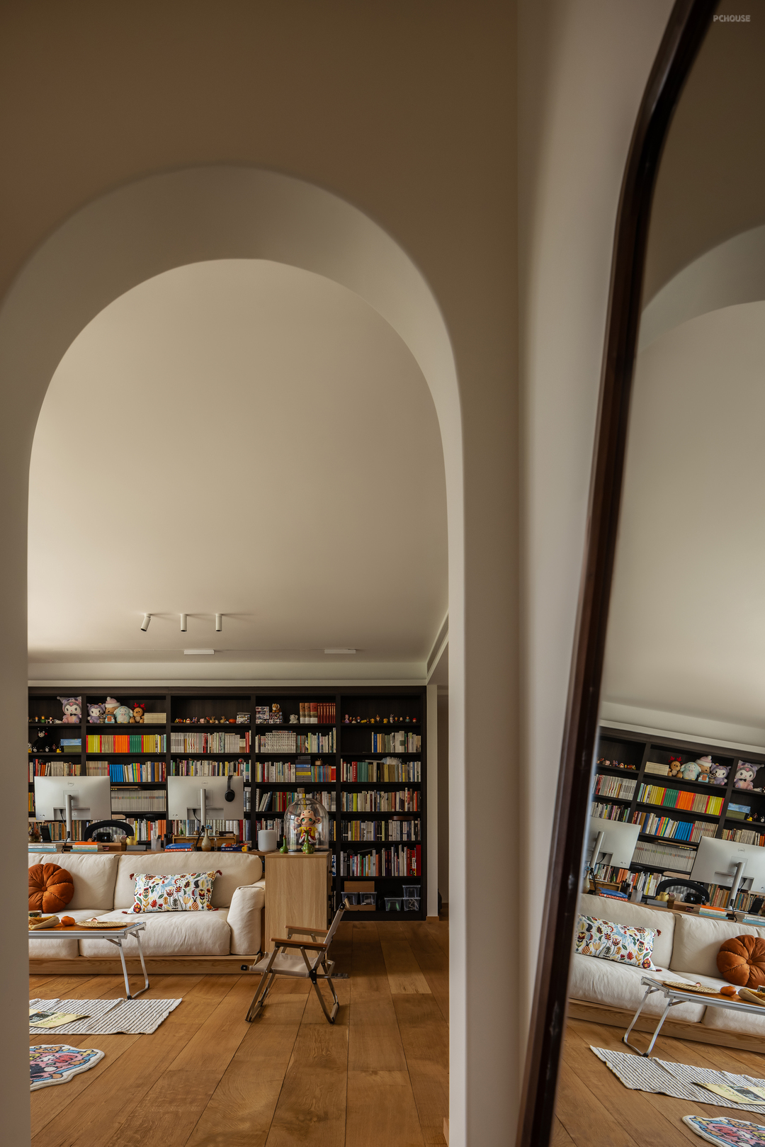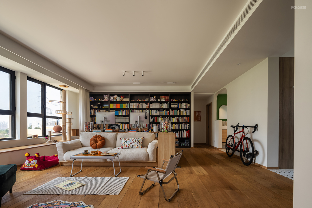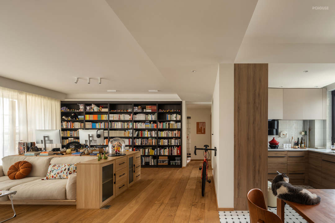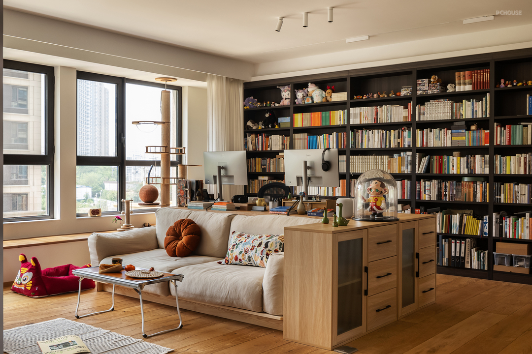 客厅是两个人最长呆的空间,办公、放松、撸猫、或者一起看个电影都很舒服,正面书柜不是为了有书墙而设计的,而是两个人真的有很多很多的书需要收纳。