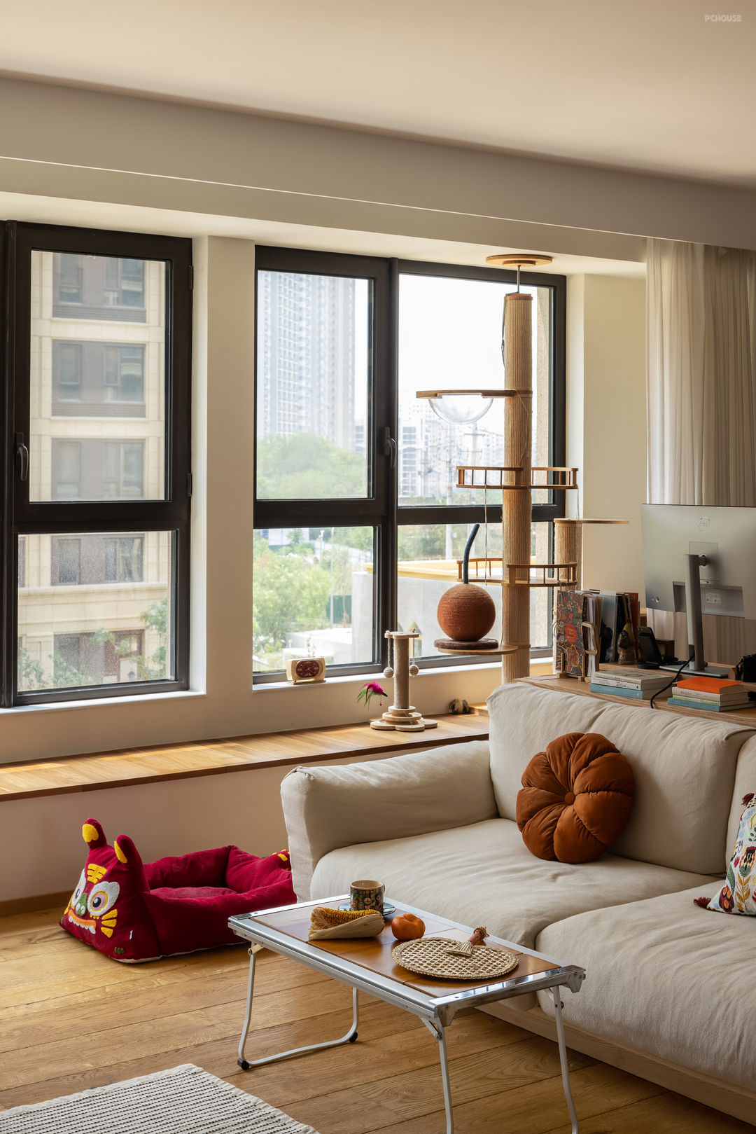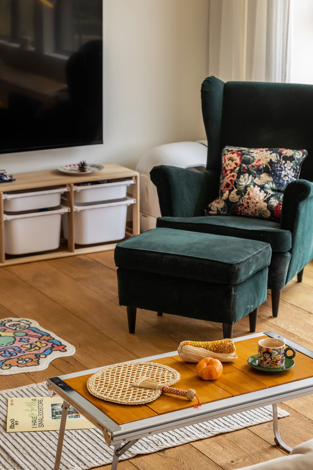 可以更灵活收纳的小柜子就是家里的电视机柜、露营小桌子是茶几,仪式感很强的猫窝,他们两个喜欢的东西都放在了这里,可以不常规,但是绝对很有自己的风格。
