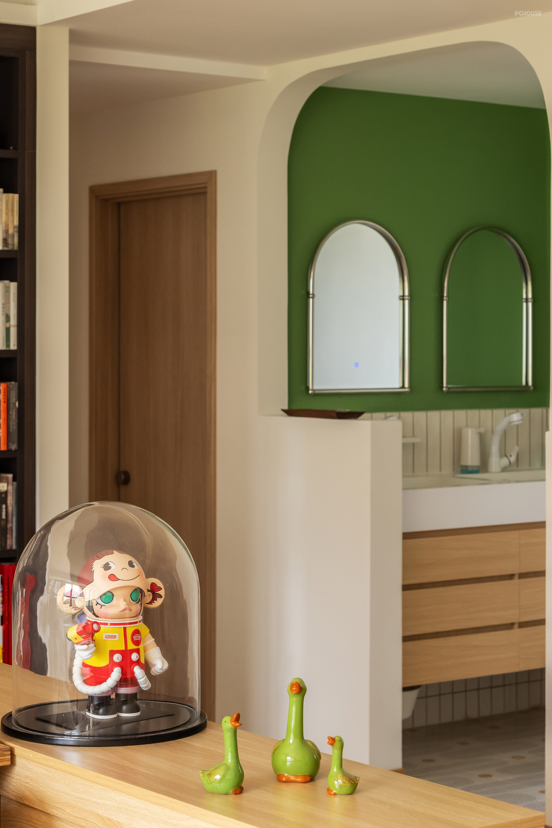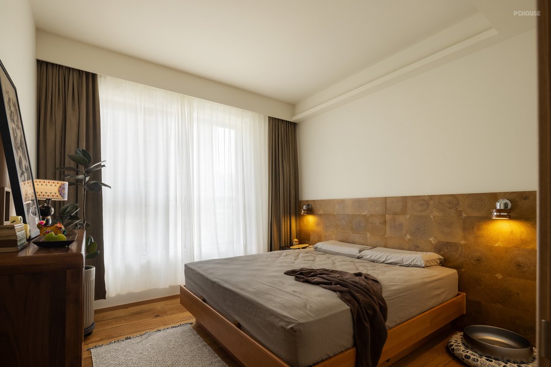 因为家里日常是两口人住,南向次卧是作为了单独的衣帽间的功能,也没有放常规的门,直接是一个造型门洞,这种松弛是很自然的。