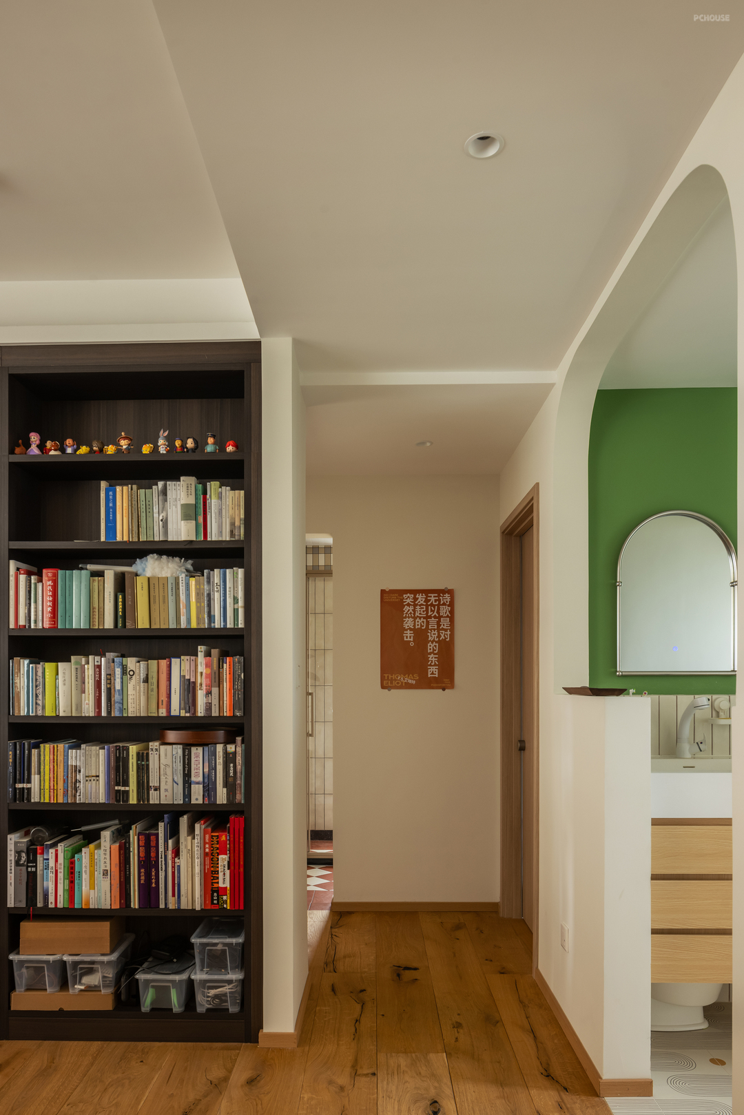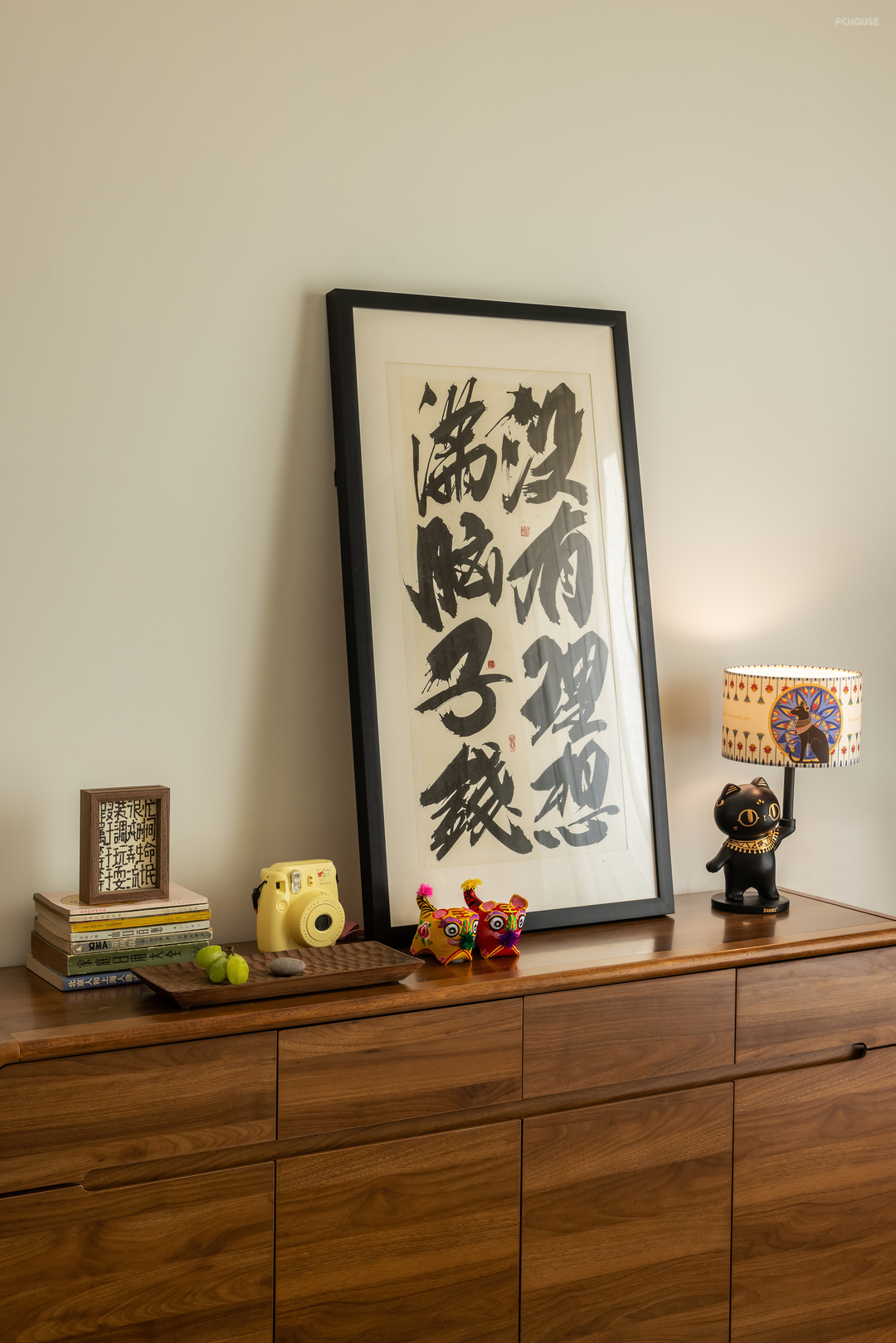 沙发、书桌、边柜这三个家具形成了客厅的功能中心,不要看他们布局简单,单纯说边柜,它是书桌的补充收纳、也是沙发的边几功能、更是走廊的一处核心小操作台,我们利用家具做了空间划分。