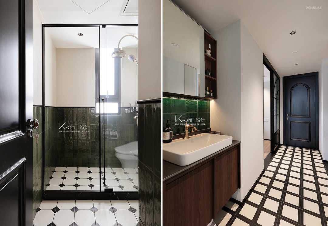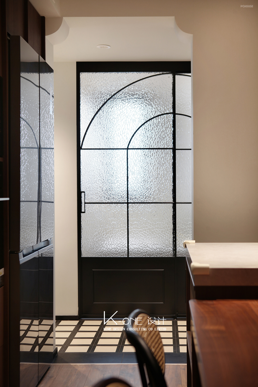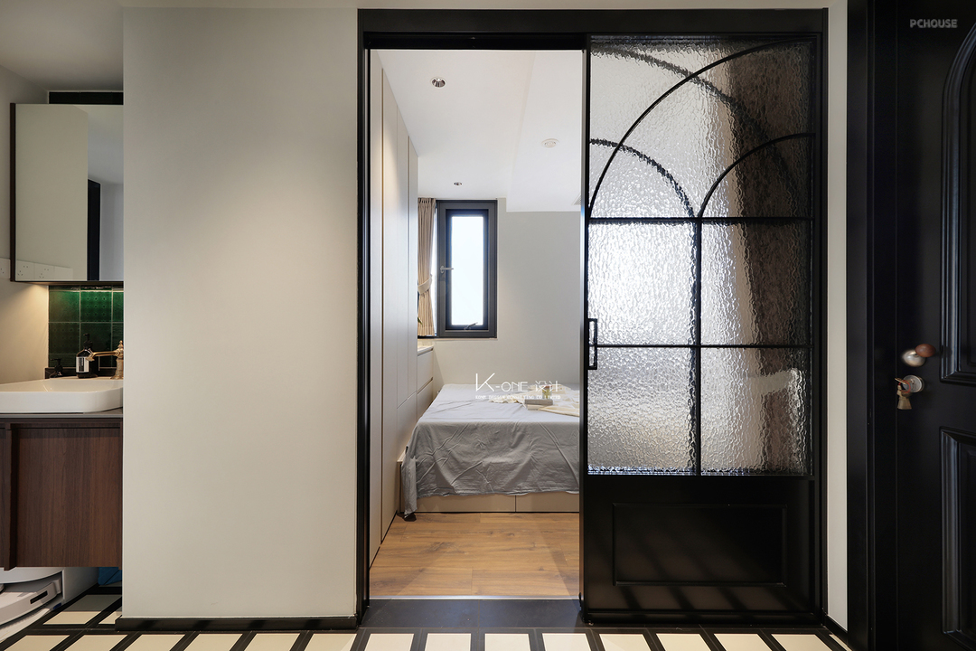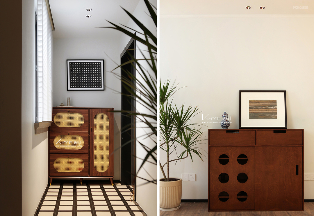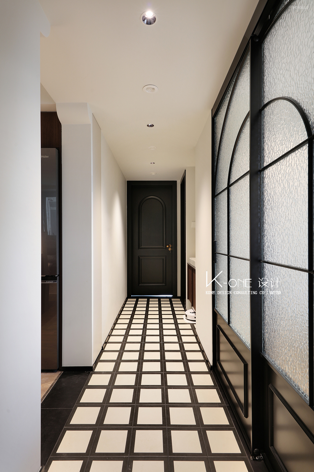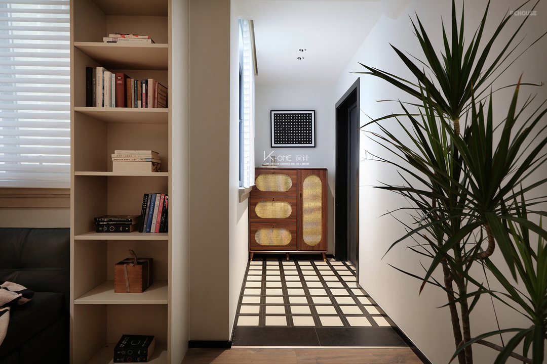 经典的黑白拼花地砖与胡桃木色家具相得益彰,点缀藤编元素空间复古又灵动。窗外的自然光透过百叶窗洒入,温暖而明亮。一旁的绿植增添了一丝生机,柔和了空间的线条。墙上的艺术装饰画则为整个环境注入了现代气息。在这个设计独特的走廊中,每一步都仿佛孕育着新的灵感与生活的乐趣。