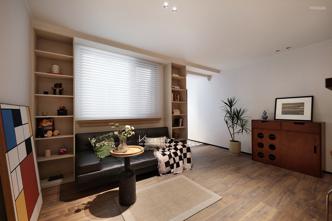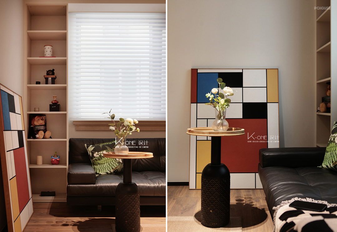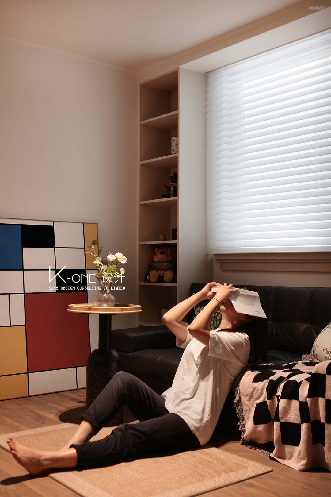 在这个温馨的角落,生活的点滴宁静被尽情享受。阳光透过百叶窗洒在沙发上,洒落的光影为整个空间增添了一丝柔和的氛围。简约的装饰与几何艺术墙面相映成趣,而手中翻阅的书籍和桌上的花卉则是生活的另一种美好体现。无论是放松身心,还是沉浸在阅读中,都让人倍感自在。这一刻,恰如生活中的小确幸,温暖而静谧,仿佛时间都在这里慢下来。