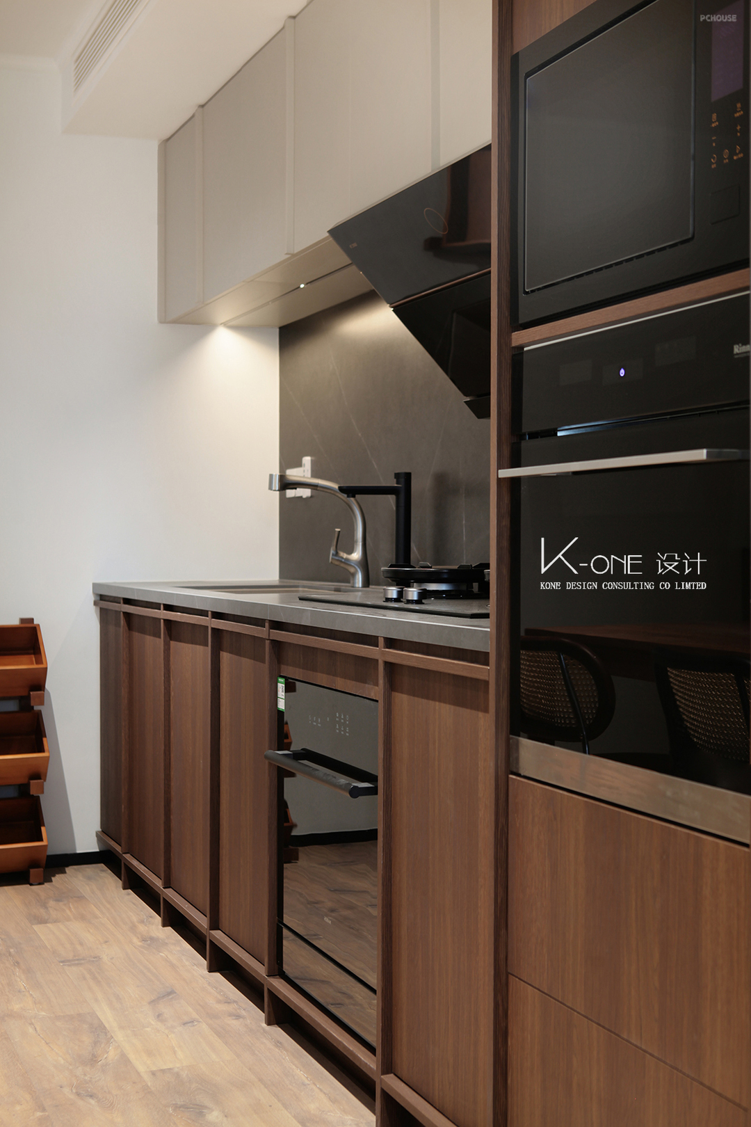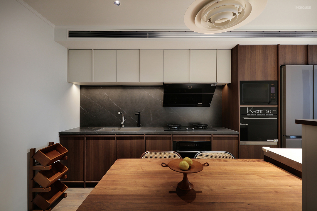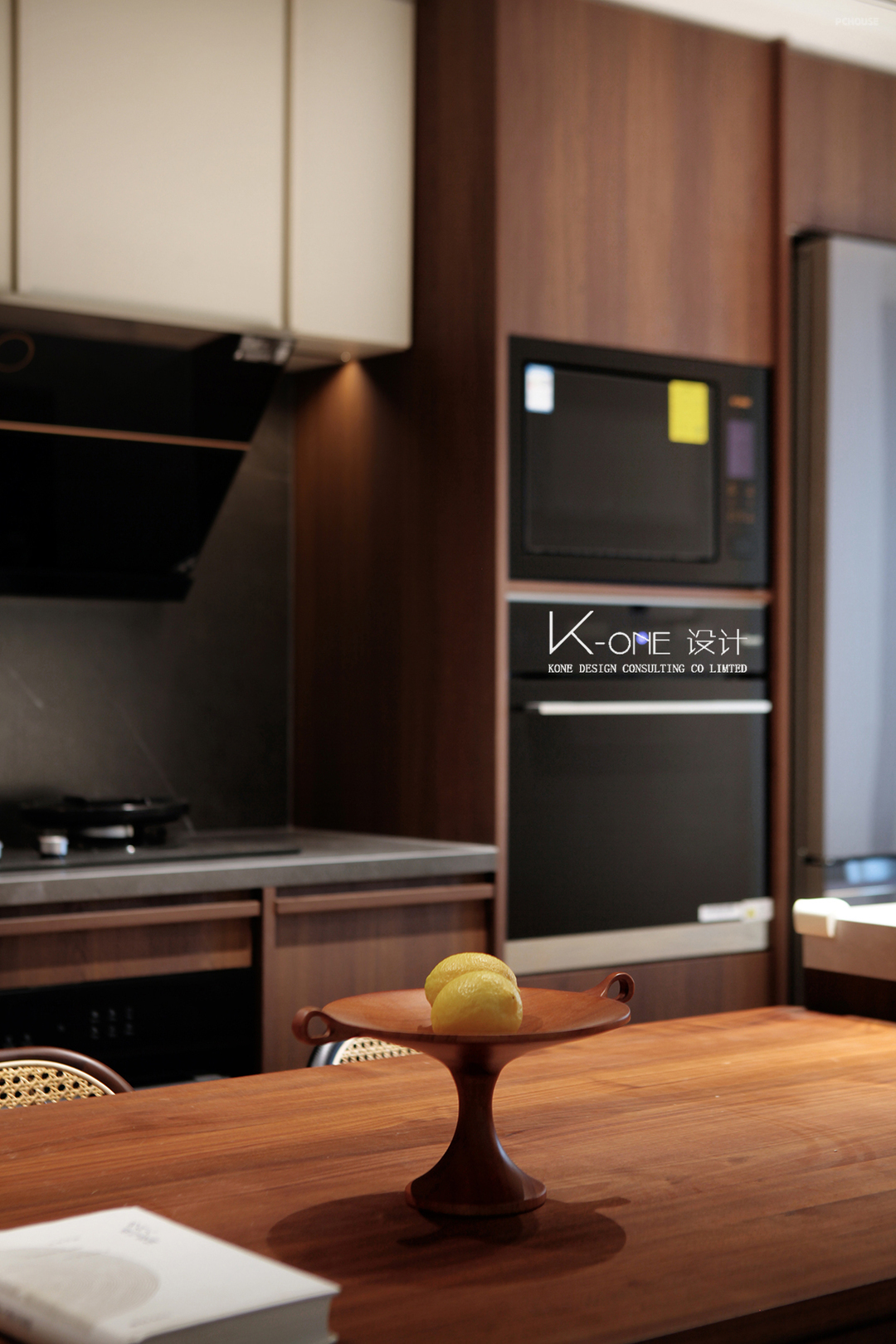厨房整体布局考虑周到,功能与美感完美结合,温暖的胡桃木与简约的设计相互辉映,营造出一个既时尚又实用的烹饪空间。深色调的橱柜与黑色台面相得益彰,为厨房增添了一份优雅。精致的水果盘上摆放着新鲜的柠檬,仿佛在提醒我们享受生活中的小确幸。让每一次的烹饪都成为一种享受。在这里,厨房不仅是烹饪的地方,更是家庭团聚和温馨时光的见证。