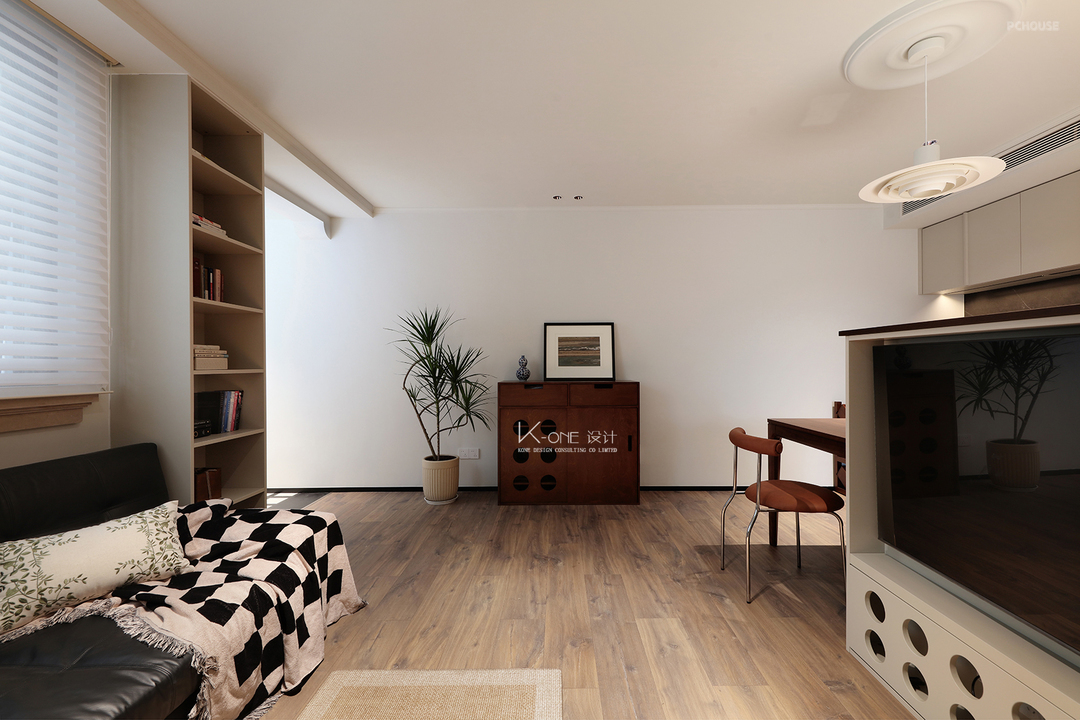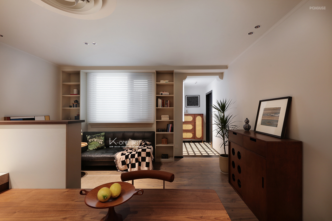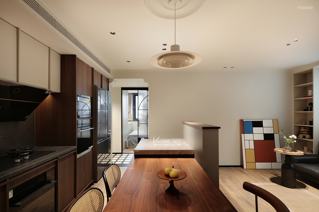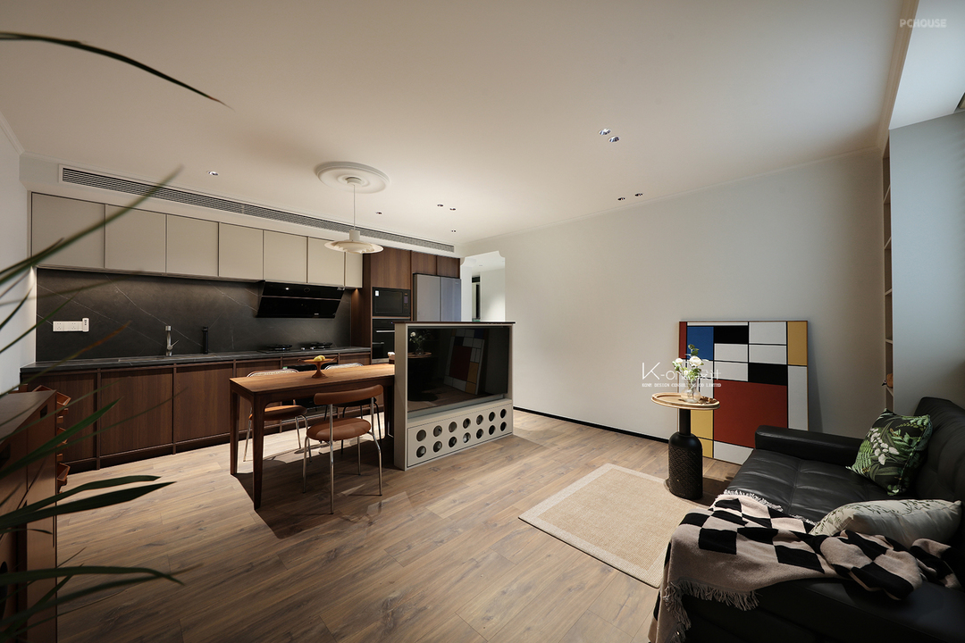 开放式的布局将厨房与客厅完美融合,营造出通透而舒适的空间感。深色木材的厨房橱柜与简约的餐桌搭配,展现出温馨的家庭氛围。旁边的黑色沙发与艺术装饰画形成鲜明对比,为房间增添了一丝艺术气息。中央的灵活隔断不仅划分了功能区,还让生活充满了灵动感。